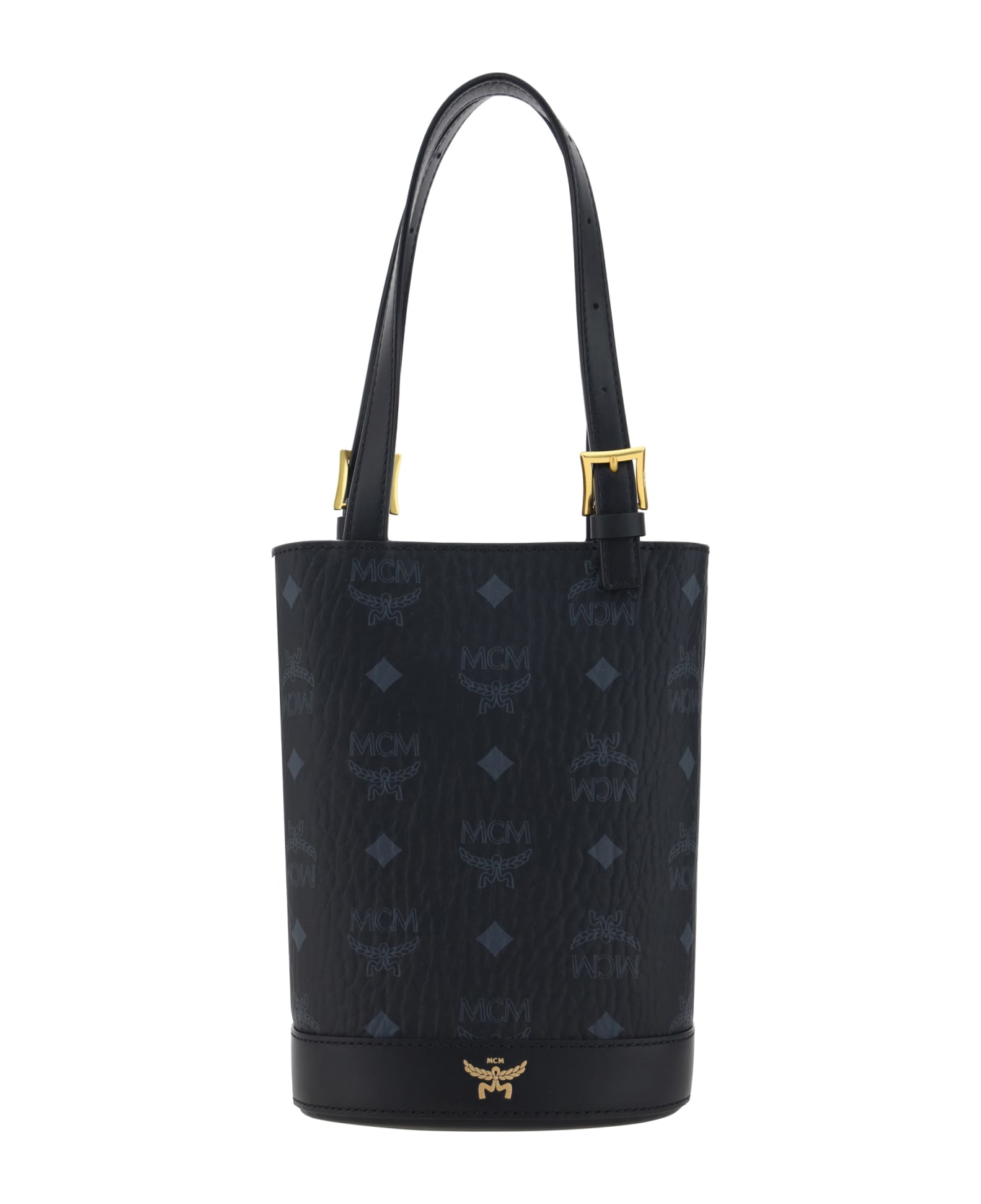 Borsa a secchiello aren tote di mcm, tracolla piatta regolabile nella parte superiore, tracolla regolabile e removibile, chiusura mediante bottone magnetico, iconico logo brand a contrasto all-over, iconico monogramma brand stampato a pressione sul fronte, pouch interna.