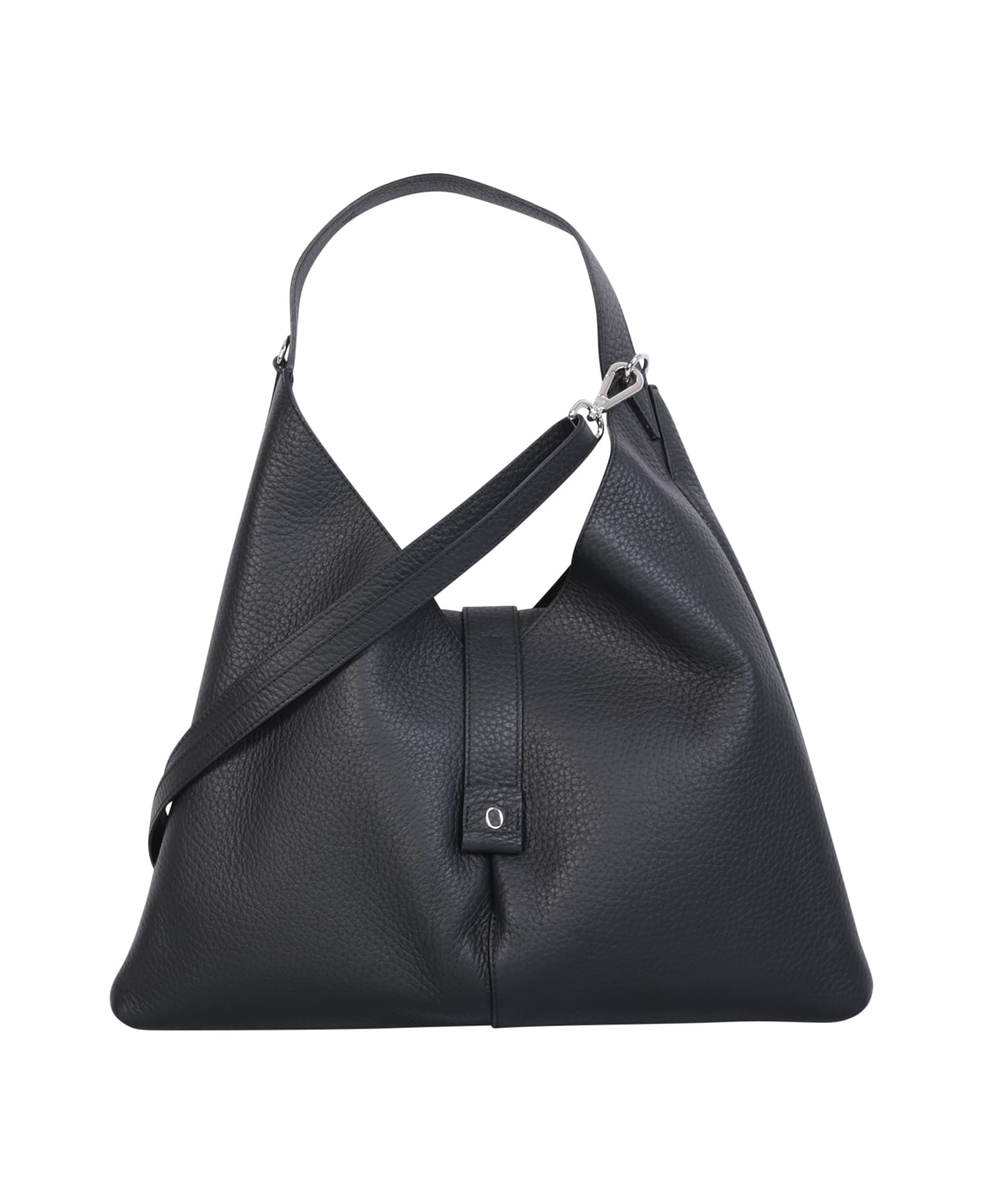 Thin foldover top. Magnetic fastening. Logo plaque. Logo to the rear. Top single handle. Main compartment. Internal zip fastening pocket. Internal logo. Adjustable detachable shoulder strap. Hammered leather. Silver tone hardware. Color: black