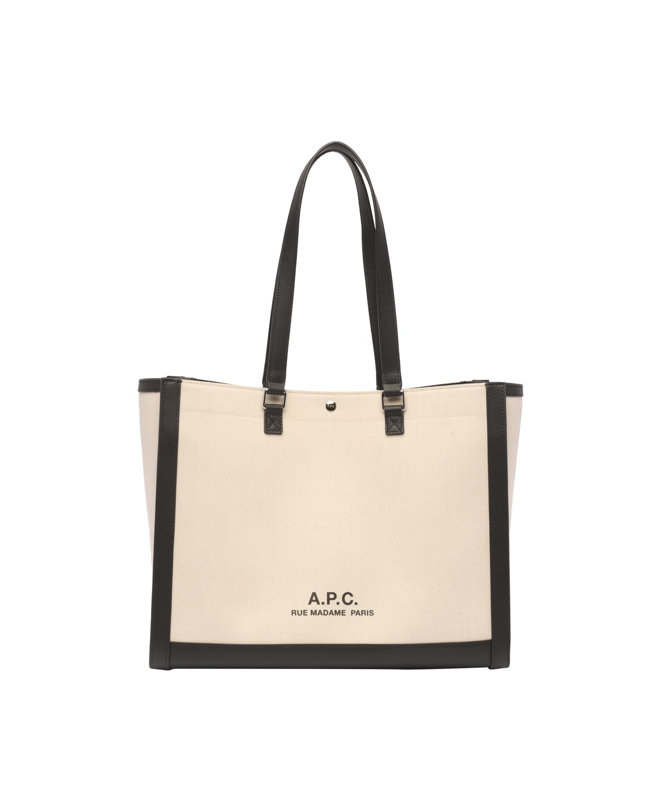 A. P. C. beige Camille 2. 0 shoulder bag, clip closure, inner zip pocket, 2 handles, frontal logo Composition: 50% Cotton, 50% Linen, 100% Calf Leather