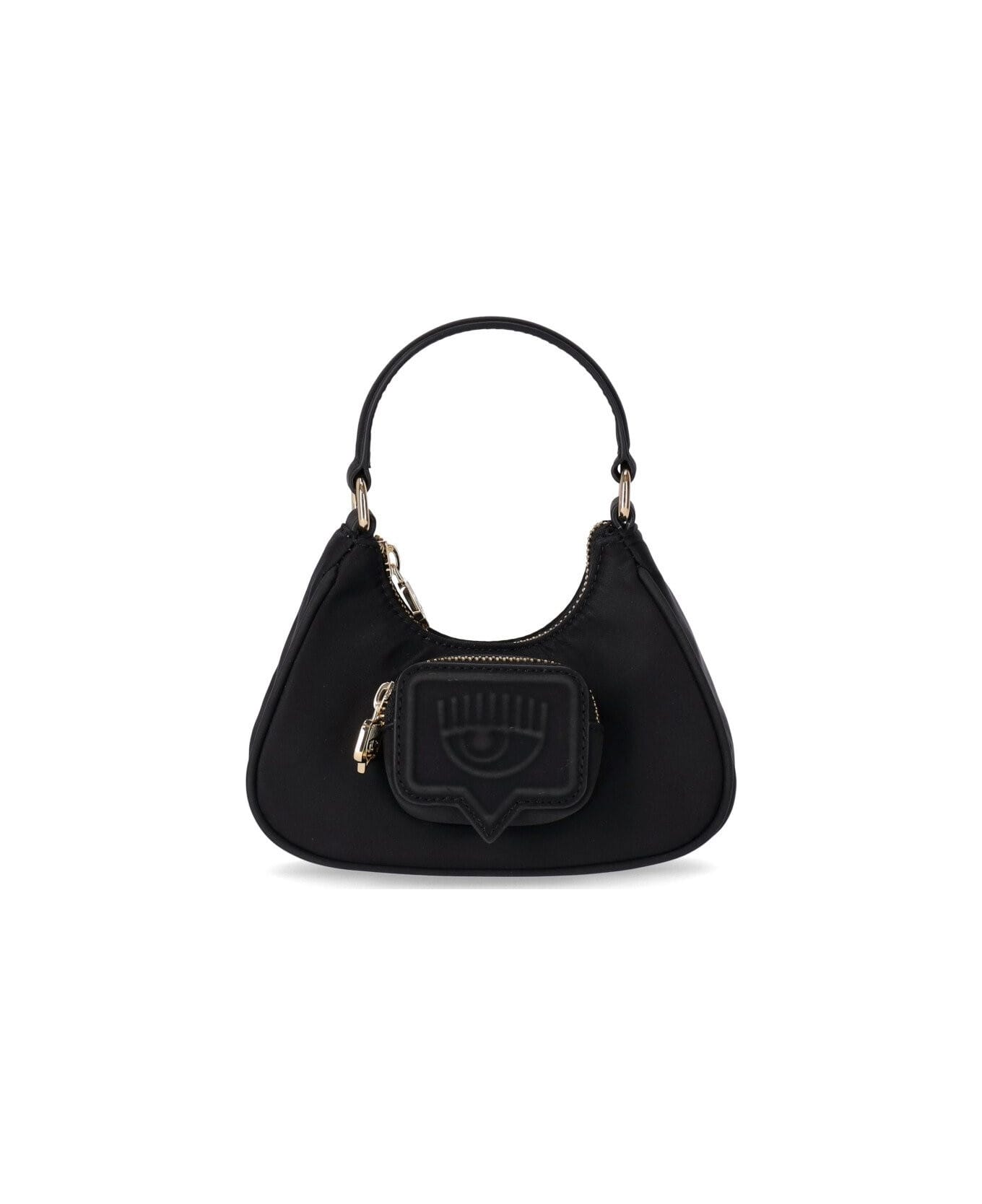 Vicky bag by Chiara Ferragni made of black nylon, featuring two compartments, one of which with embossed logo. Golden metal chain shoulder strap and zip closure. Measures 18x12x5 cm. Composition: 100% polyester.