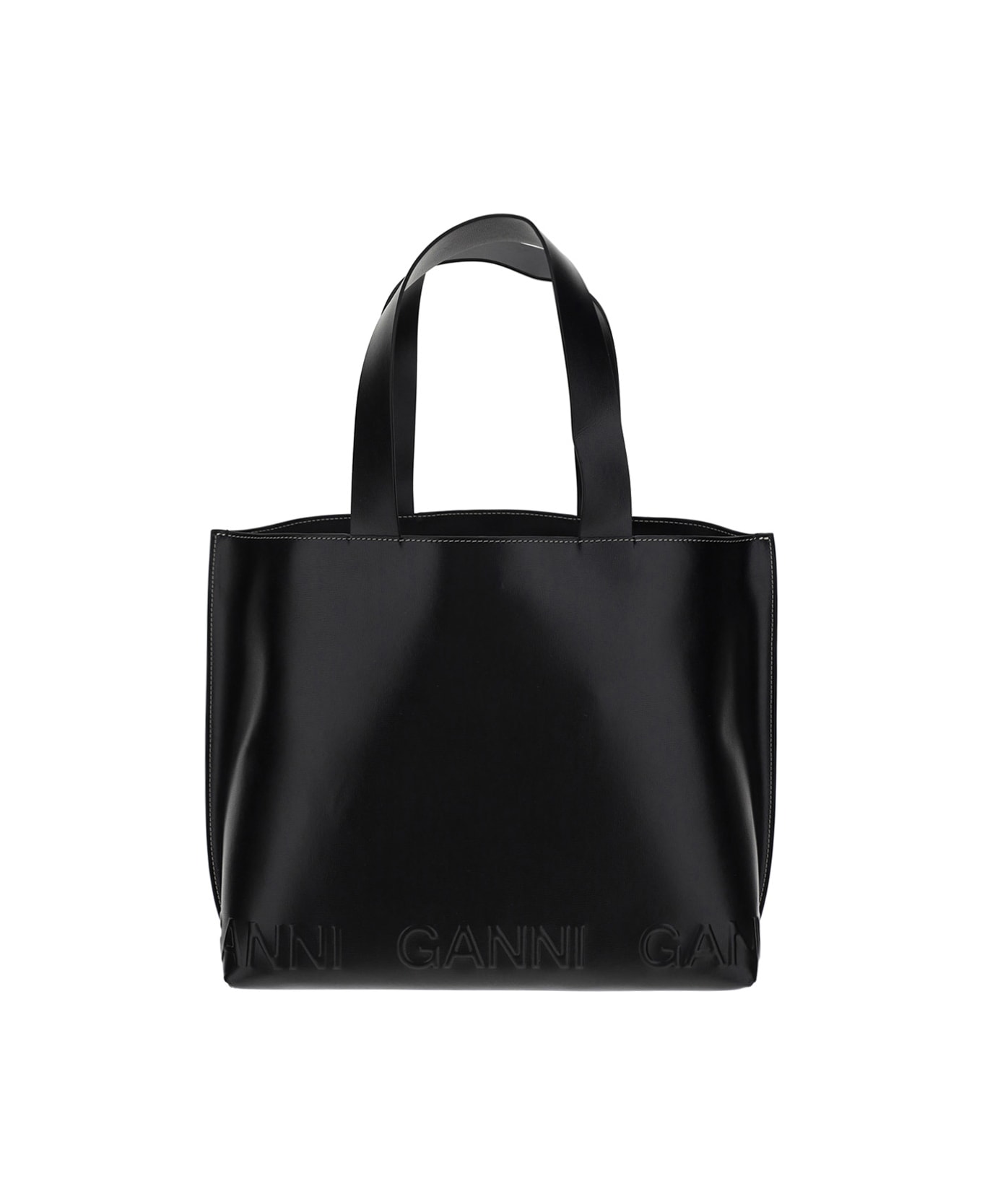 Calfskin east west tote bag by ganni, embossed logo on front and back, interior snap closure, two rounded top handles, removable and adjustable leather shoulder strap, single interior compartment, leather design with matte finish, made from partly recycled materials.