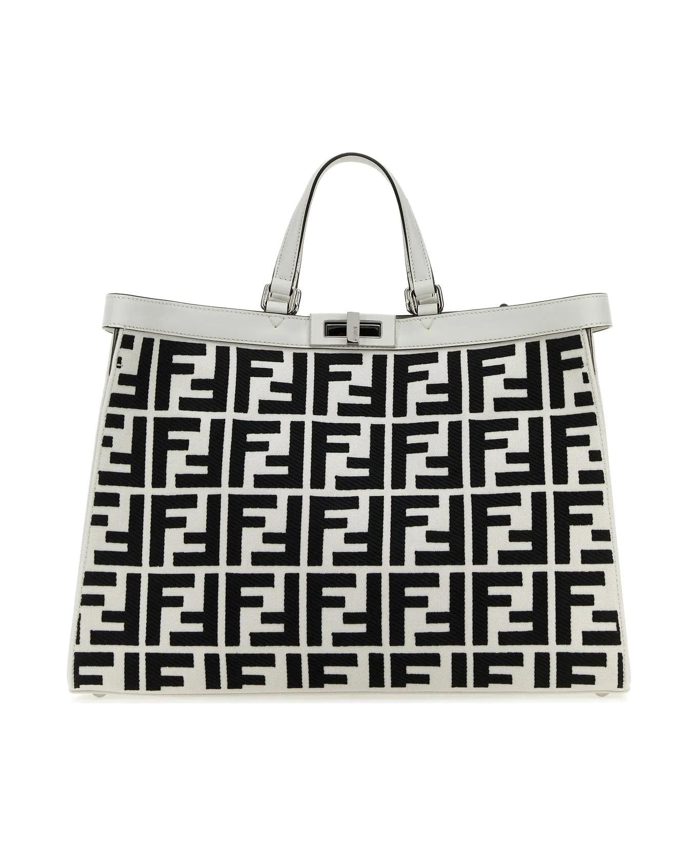 Shopping bag realized in fabric with leather trimming characterized by houndstooth motif embroidery on the entire surface and FF embroidery in relied at the front. - Four flat tonal leather handle - Snap-fit closure - Lined interior with a patch pocket - Protective metal feet at the base Composition: Exterior: 80% Wool 18% Cotton 2% Elastane Lining: 80% Wool 18% Cotton 2% Elastane Finishing: Silver metal