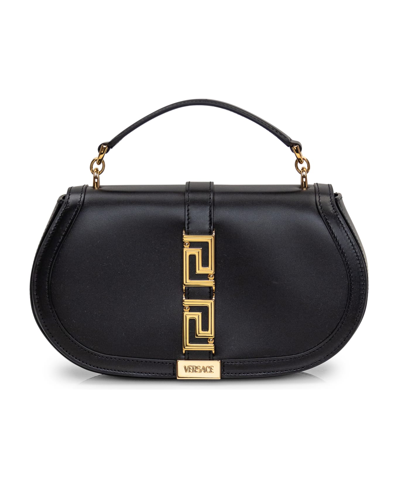 Black handle bag. One handle. Removable shoulder strap with chain. Closure with flap and button. Metal Greca detail on the front. Composition: Outside:, 100% Calfskin
