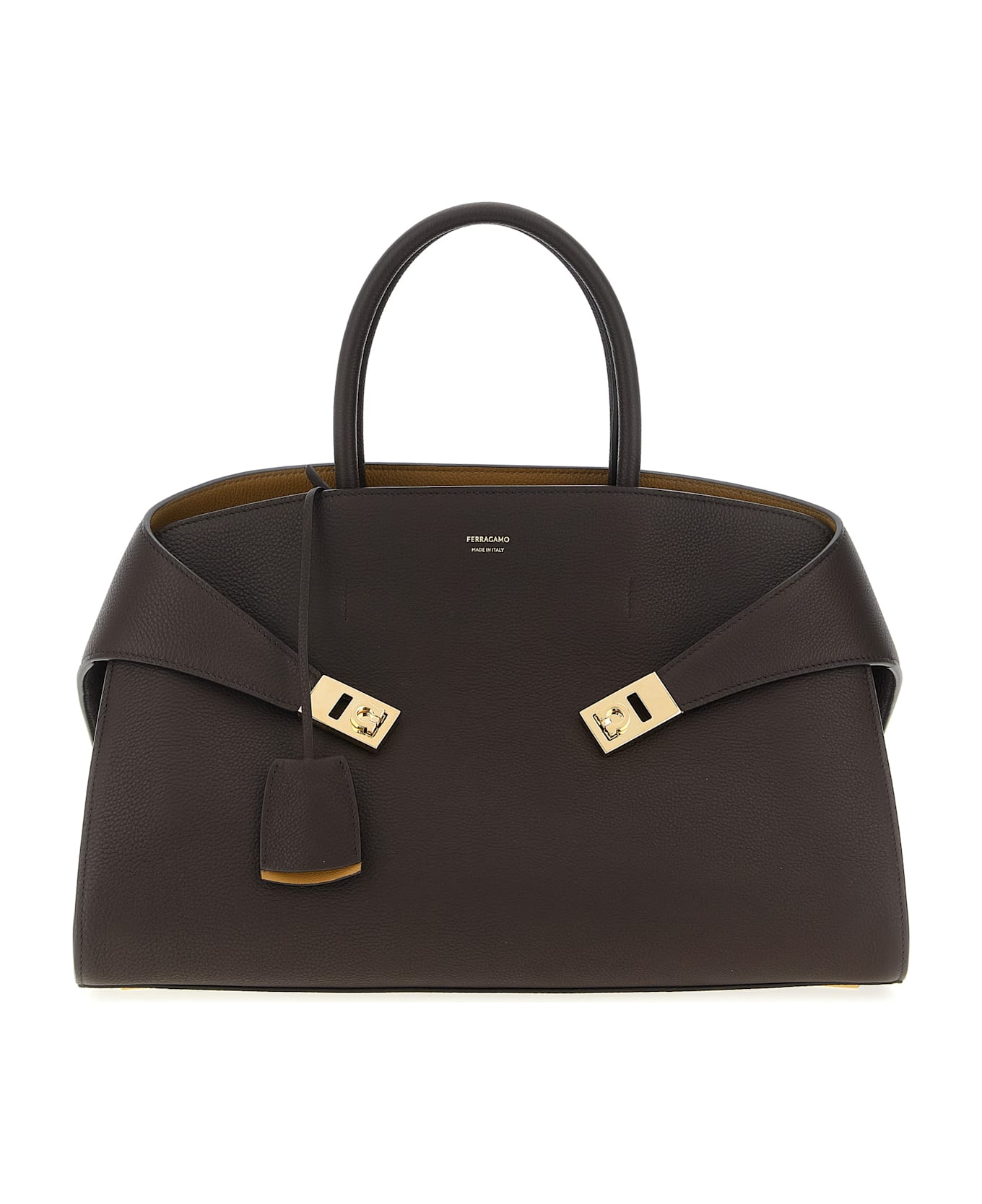 'Hug M' hammered leather handbag with front embossed logo, side gussets with Gancini buckle decoration, bitter closure, double fixed handle, metal details, removable keyring charm. Composition: 100% calfskin leather (Bos Taurus)