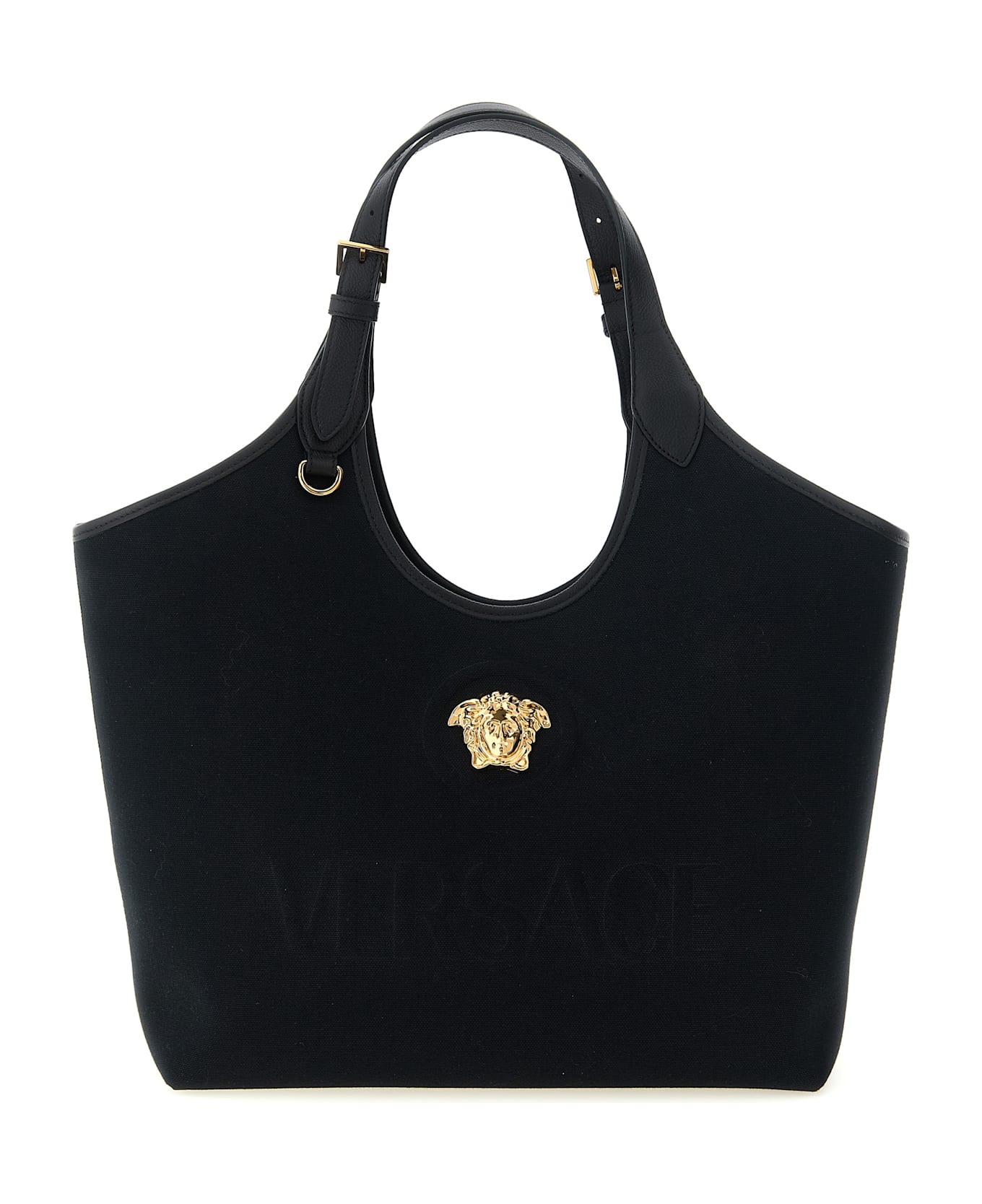 Medium 'La Medusa' canvas shopping bag with contrast leather details, metal 'La Medusa' detail and front 3D logo, double adjustable handle, internal snap button closure, rigid base with metal feet, adjustable and removable shoulder strap.