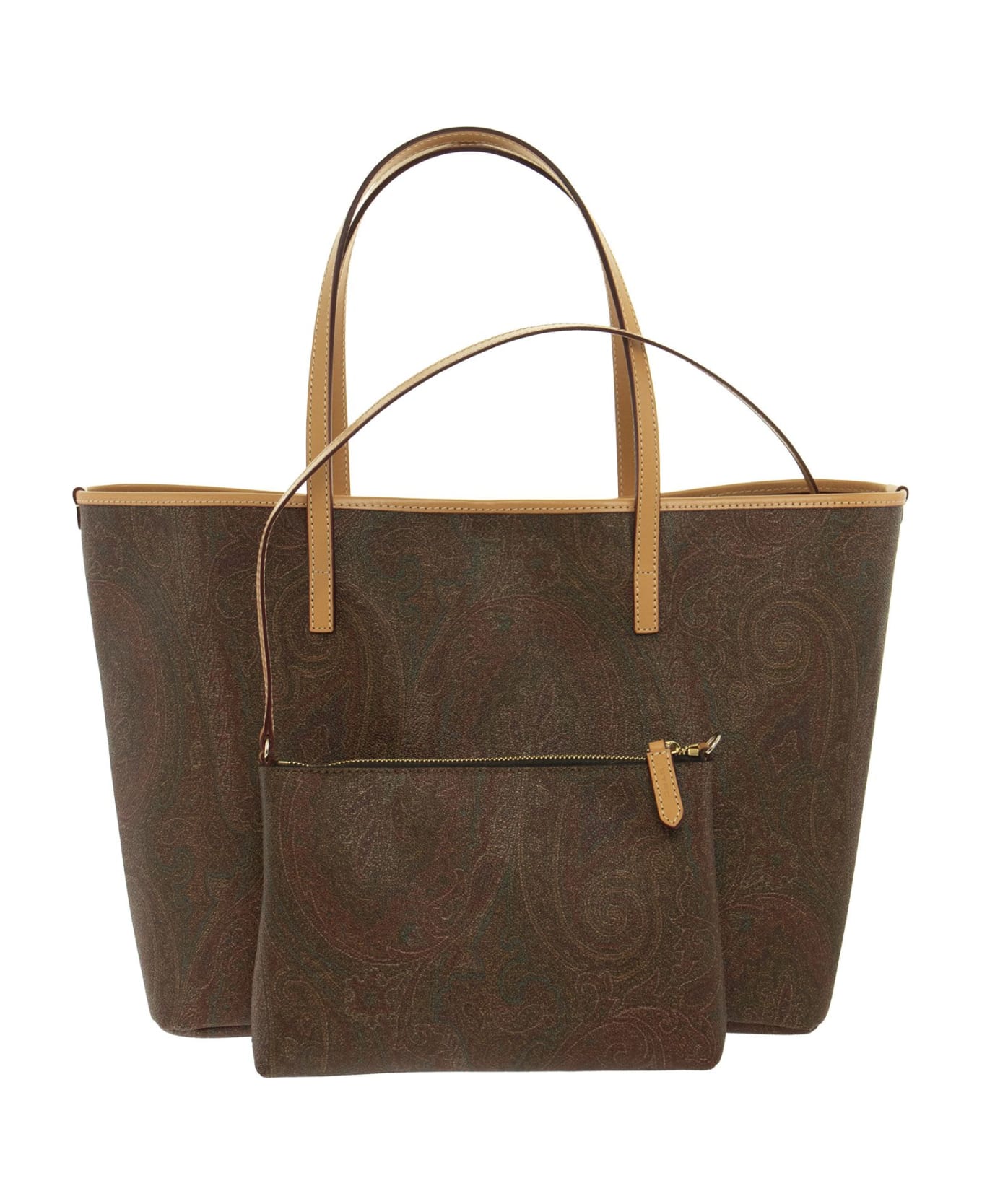Shoulder bag in Etro's iconic Paisley jacquard fabric. it contains a removable pouch in the same jacquard pattern. - Internal zip pocket - Snap hook closure - Removable pouch - Gold tone metal hardware - Lined in ETRO logo fabric DESIGNER ID: 0B374 8010 600 Composition: Exterior: Paisley jacquard cotton glazed with matt texture and lined in canvas Finishing: 100% calfskin Lining: 66% cotton, 34% polyester