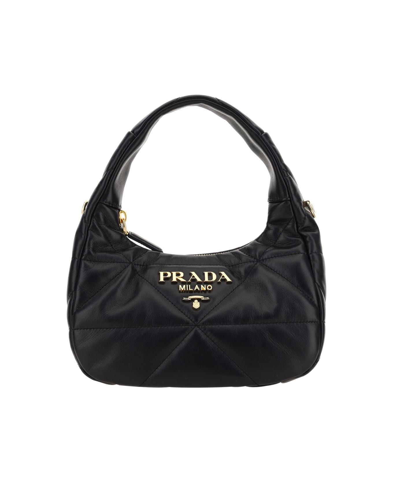 Calfskin mini handbag by prada, tubular top handle, removable and adjustable thin flat leather shoulder strap, all-over padded and quilted design, top zipper closure, iconic brand monogram embossed and gold-plated on front, inside welt pocket. Composition: 100% % Calf Leather Bos Taurus