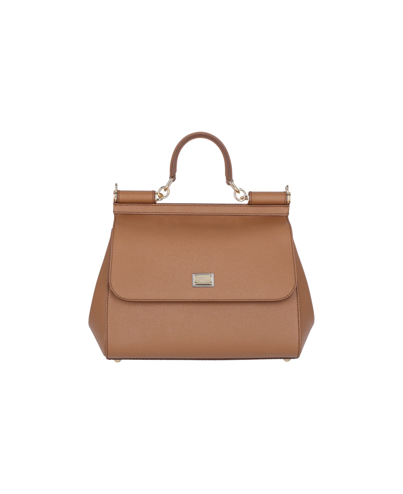 Dolce & Gabbana Sicily Medium Bag, brown grained leather, one top handle, removable adjustable shoulder strap, gold logo ferry front, magnetic button closure, one interior zipper pocket, one main interior compartment. Composition: Outer: 100% Calfskin, Inner: 80% Cotton, 20% Calfskin