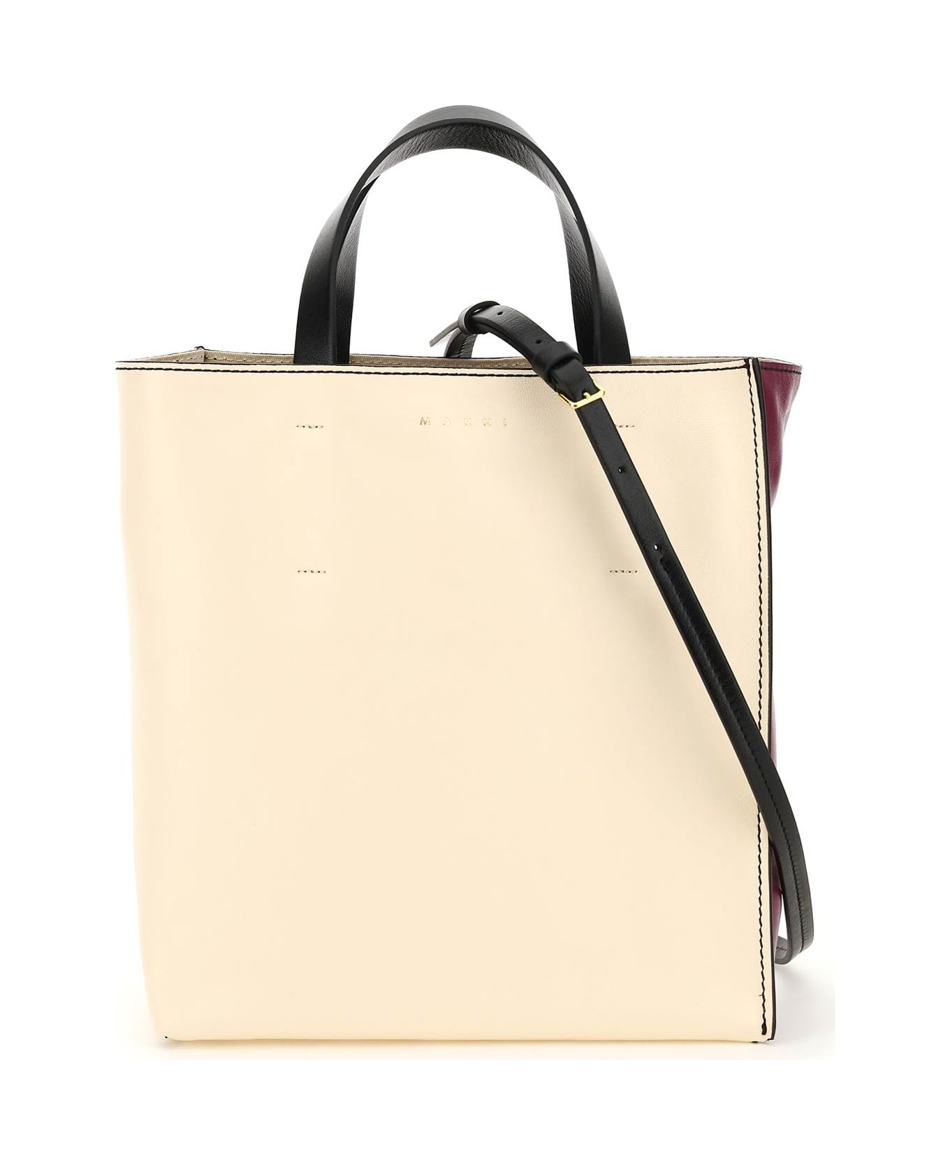 Small Museo bag by Marni crafted in bicolour leather with gold-tone lettering logo print on front. Double top handle and adjustable and detachable shoulder strap in contrasting leather. Cotton lining, one inner leather patch pocket with zip closure. Gold-finished metalware. Composition: 100% pelle bovina