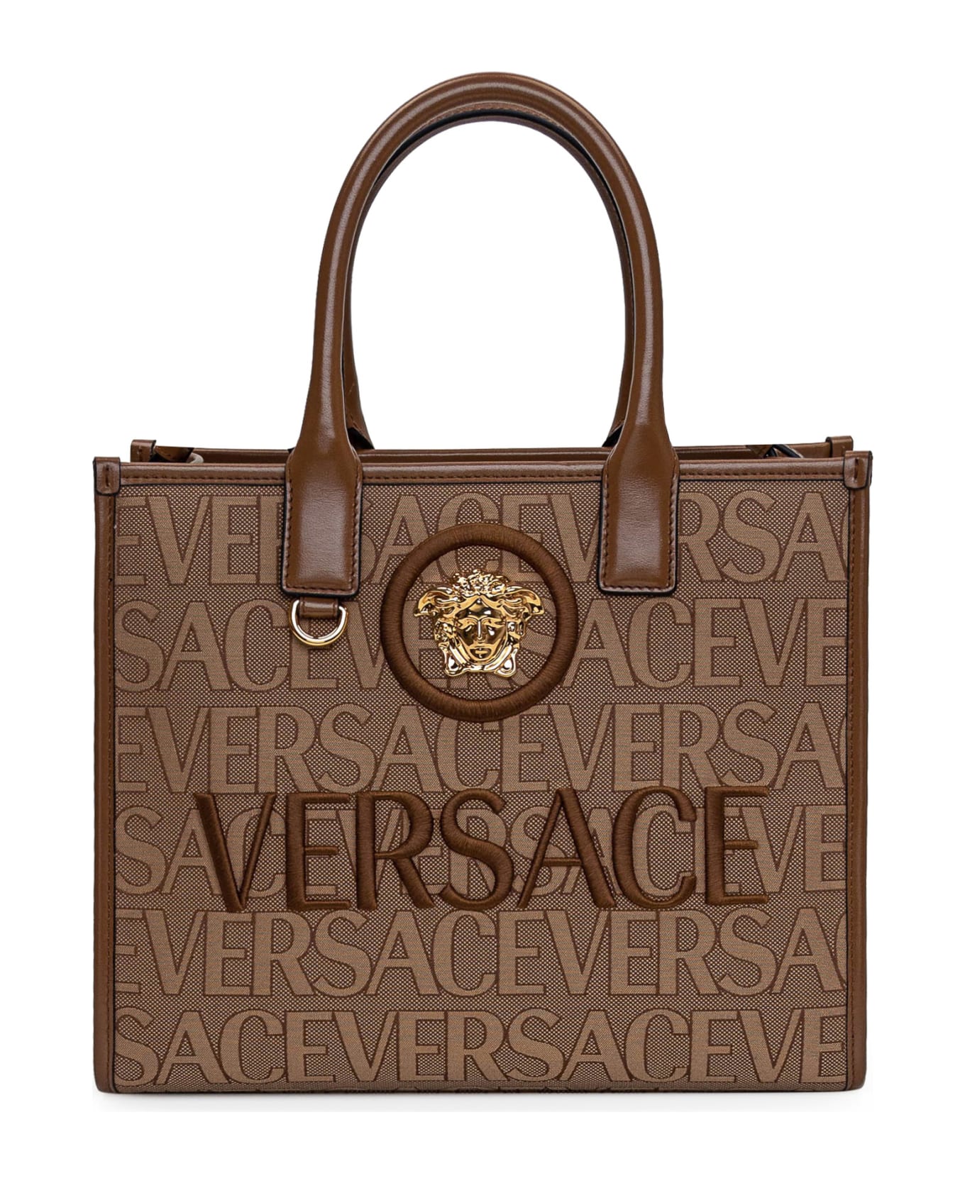 Brown shopper bag. Two handles. Adjustable and removable shoulder strap. Button closure. Two inner pockets. Medusa and embroidered logo on the front. Logo all-over.