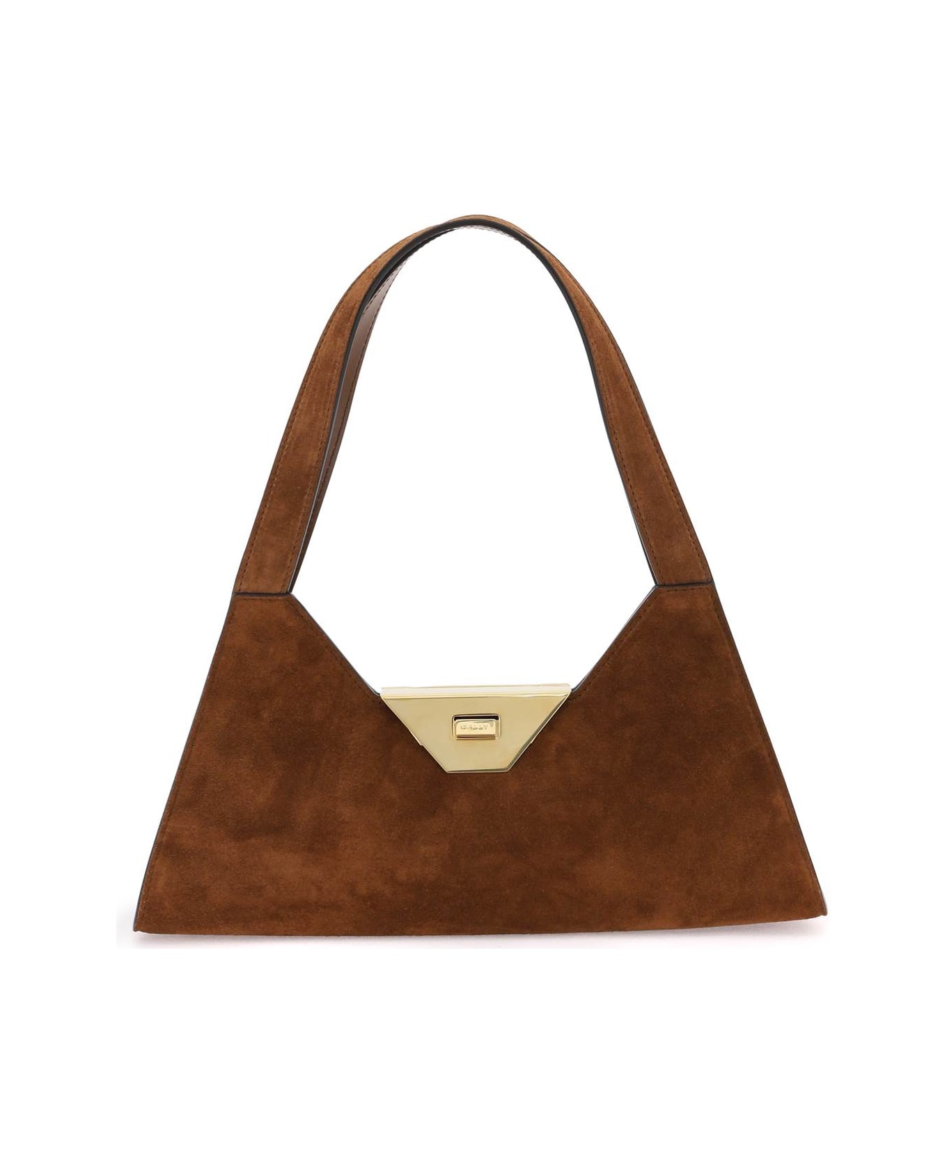 Trilliant shoulder bag by Bally made of suede and characterized by a boxy silhouette and gold-tone metal interlocking closure featuring engraved logo. Smooth leather-lined interior with one zippered pocket and one open pocket, double top handles.