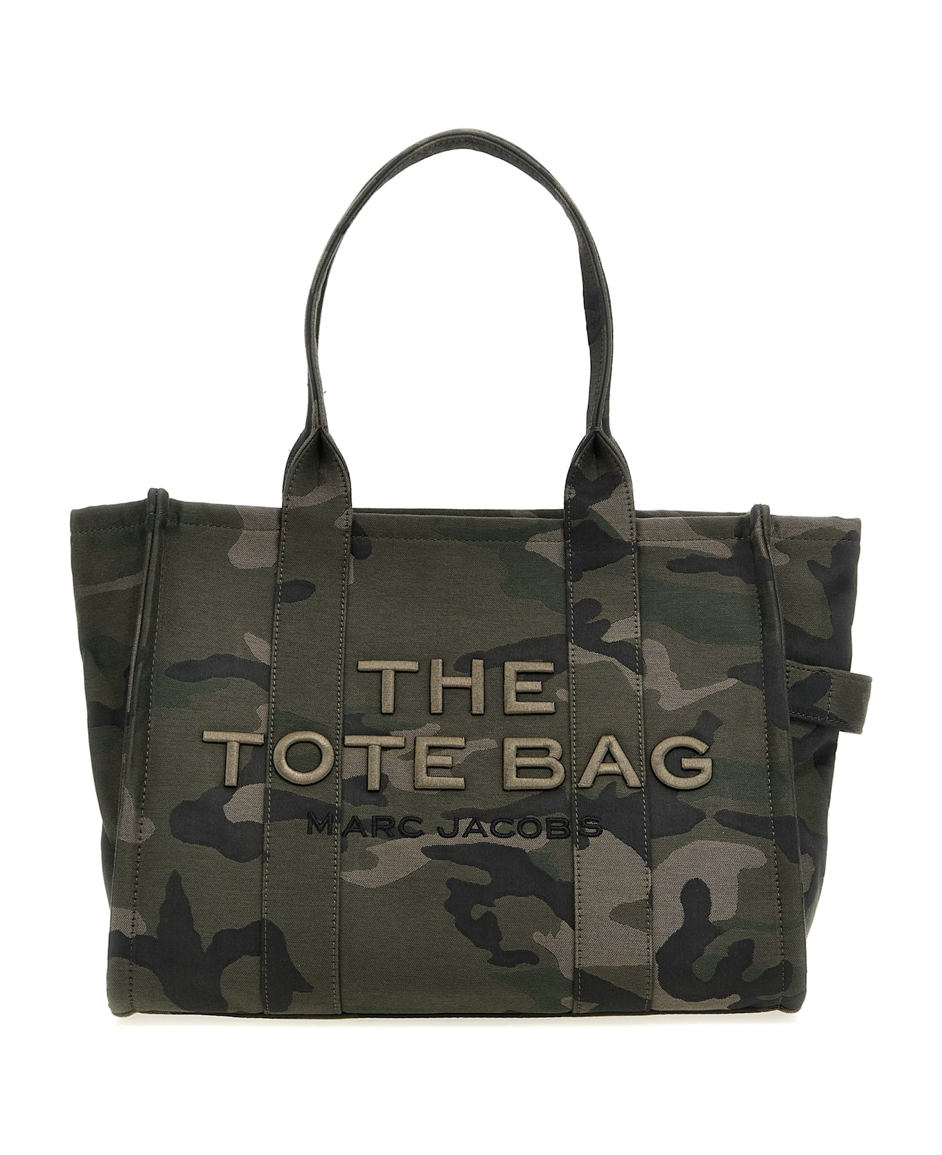'The Camo Jacquard Large Tote' shopping bag in a special camouflage jacquard fabric, front embossed logo embroidery, double fixed handle, zip closure, contrast twill lining.