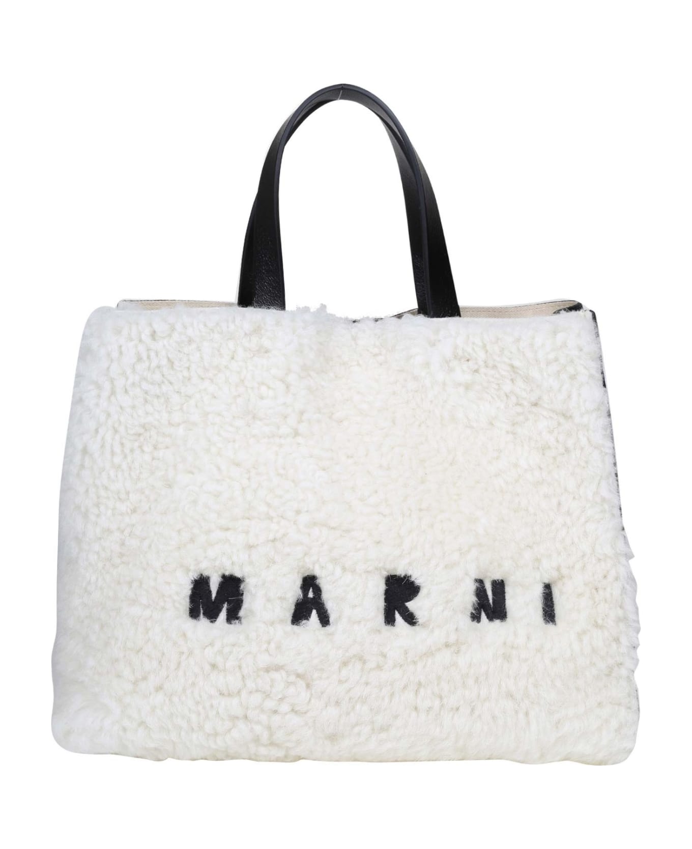 Handbag in shearling and leather black and white color snap button closure an internal zip closure adjustable and removable leather shoulder strap double leather handles front fabric logo composition: width 28. 5cm height 24cm depth 12cm composition: lamb hair and cowhide made in italy