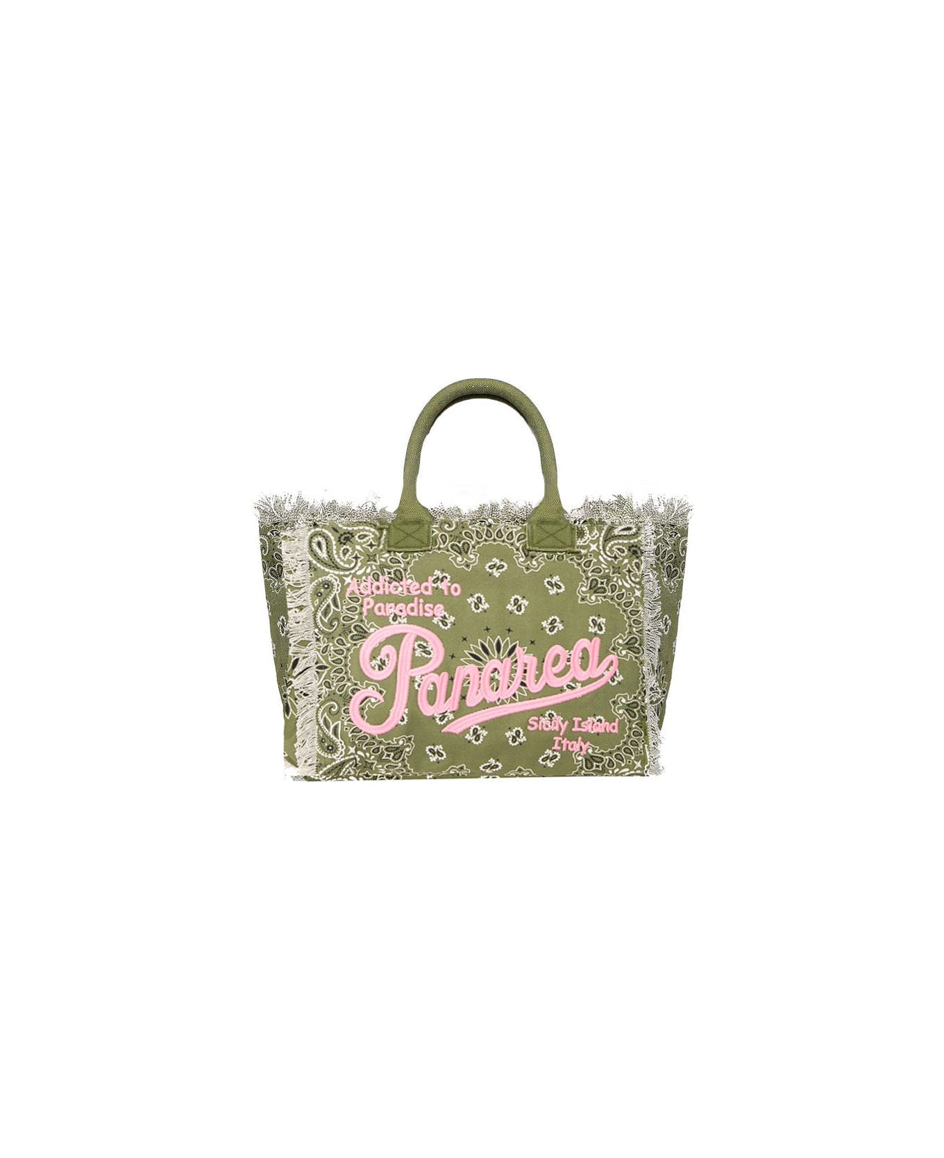 Military green bandanna all over print Panarea pink writing embroidered Inside pocket with zip Sizes: 40cm x 32cm x 20cm