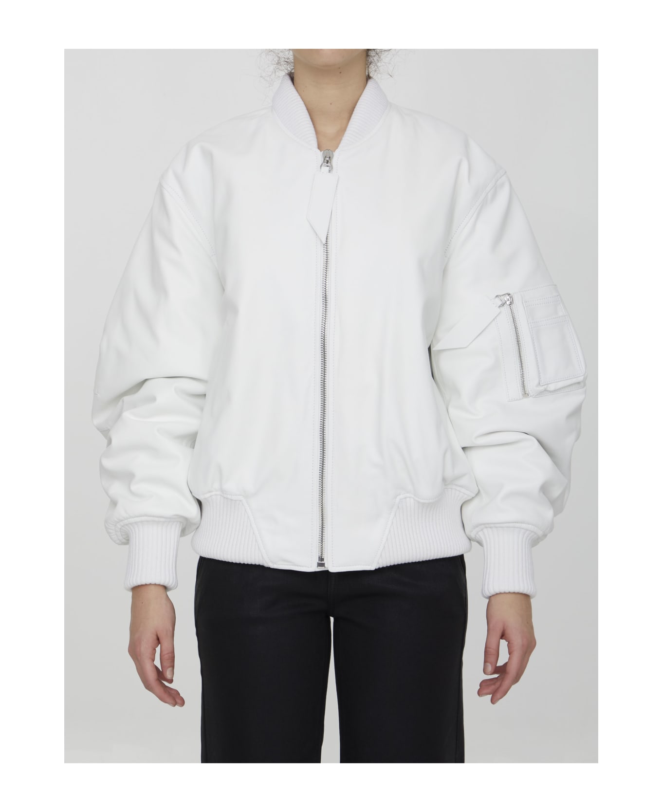 Anja oversized bomber jacket in white lambskin. It features front zip closure, two side welt pockets, a zip pocket on left sleeve and ribbed trims on neck, cuffs and hem. The model is 180cm tall and wears size 38.