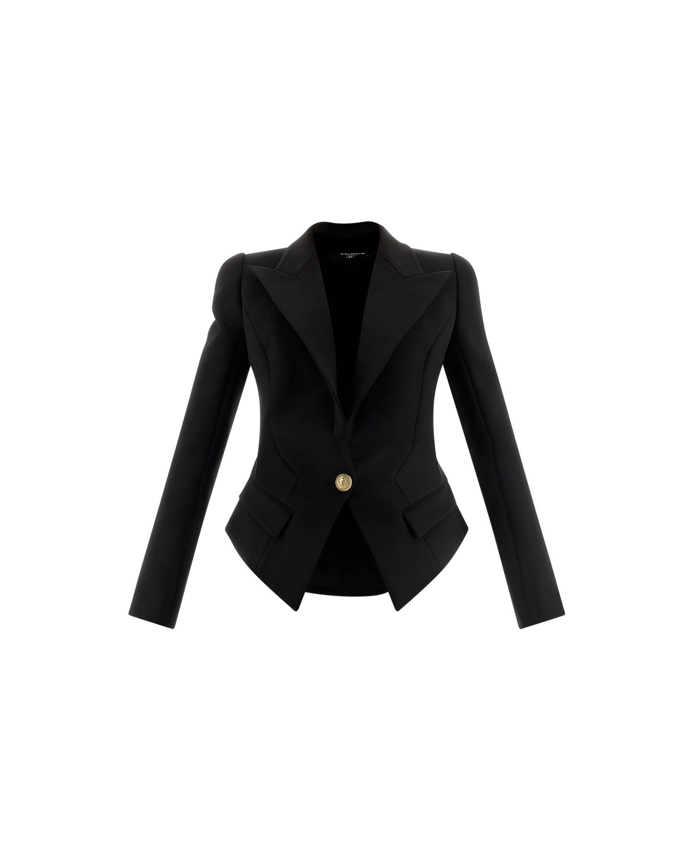 Cotton blazer jacket by balmain, double-breasted front closure with contrasting single button, embossed and gold-plated button, geometric peaked lapels, two welt pockets with side flaps, back slit, structured shoulders, regular fit.