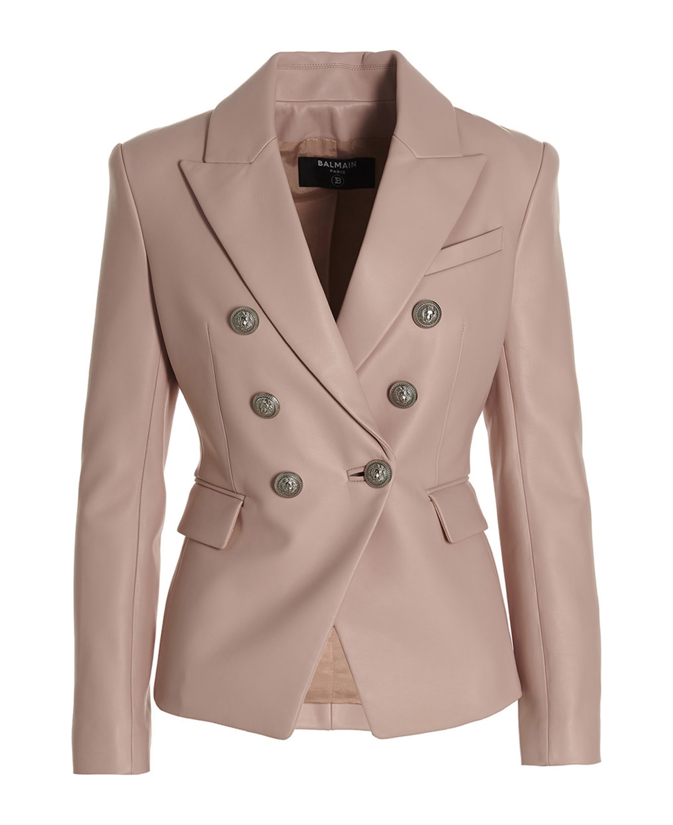 Double breast leather blazer with button closure, pockets, padded shoulders and long sleeves. Composition: 100% lamb leather