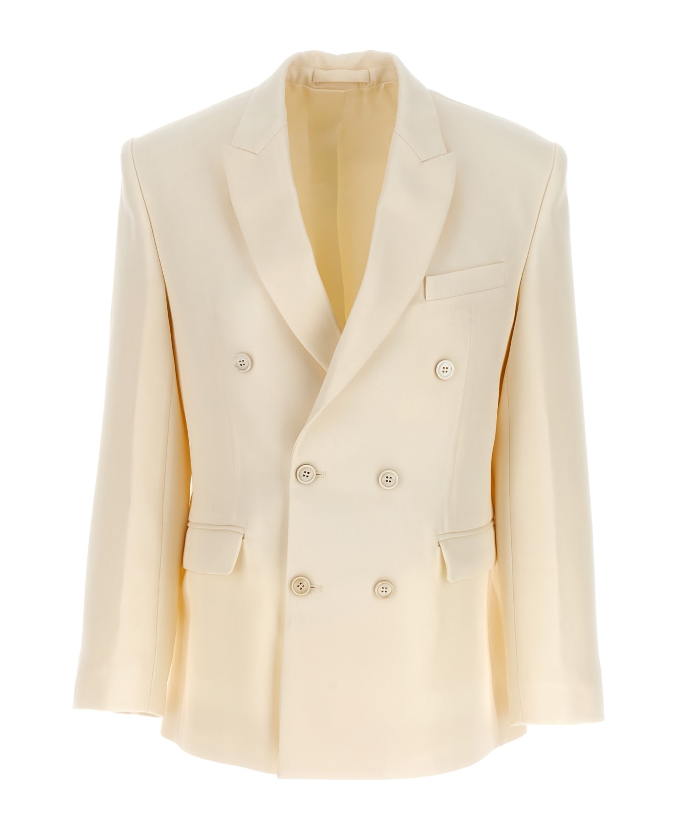 Double-breasted wool blazer with peak lapels, pockets, and double slit at the back.