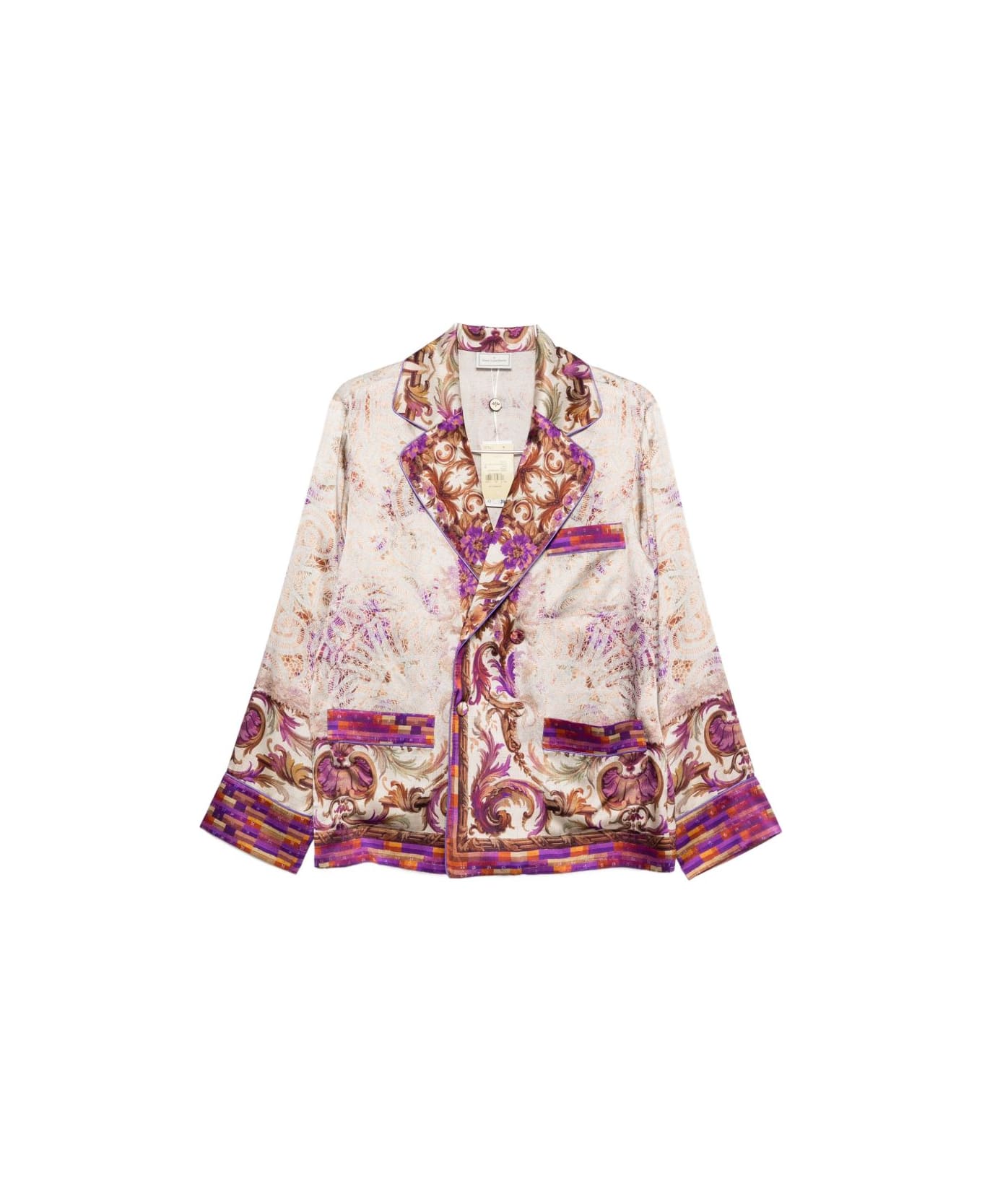 beige and purple silk floral print notched lapels patch pockets button fastening