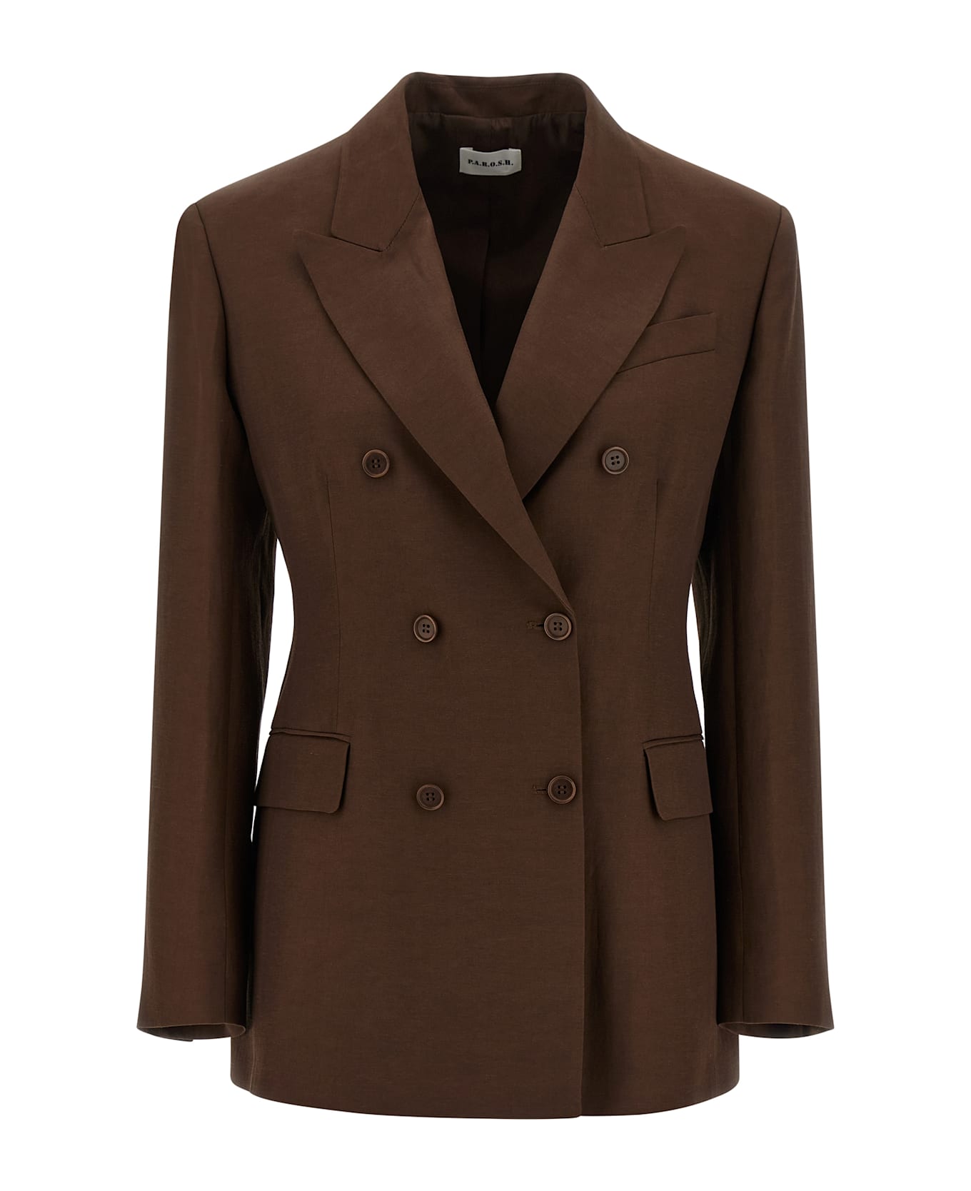'Raisa' double-breasted linen blend blazer with front button closure, V-neck with lapels, slightly padded shoulders, front pockets, long sleeves with buttons and inner elastic hidden on the wrist.