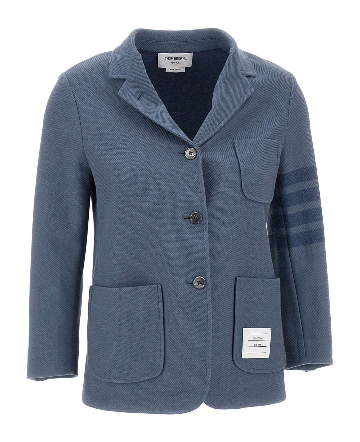 Thom Browne "Sack In Double Face" women's cotton blazer, sugar paper color, classic collar with lapels and button, fastening with two logoed matching buttons, two front open pockets with white logo patch, iconic four stripes on left sleeve, cuffs with four buttons, gros-grain details, central vent on back, regular fit. Made in Italy.