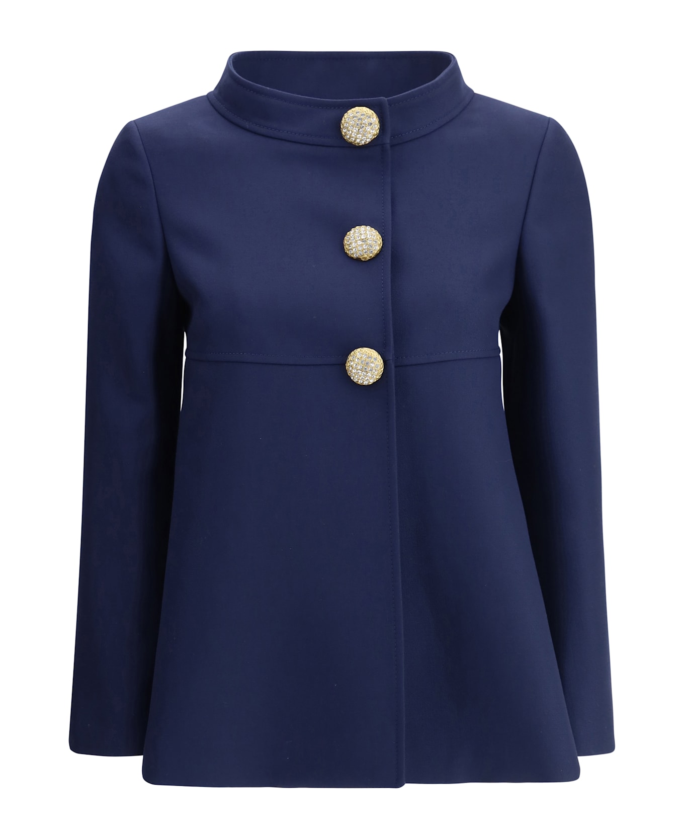 Valentino's caban jacket features a sleek and sophisticated design with a high collar that adds a touch of sophistication. the a-line silhouette lends a figure-flattering shape, while the front closure with jeweled buttons lends a luxurious and distinctive accent. the back slit adds an element of movement and comfort, completing a garment that combines classicism and modernity.