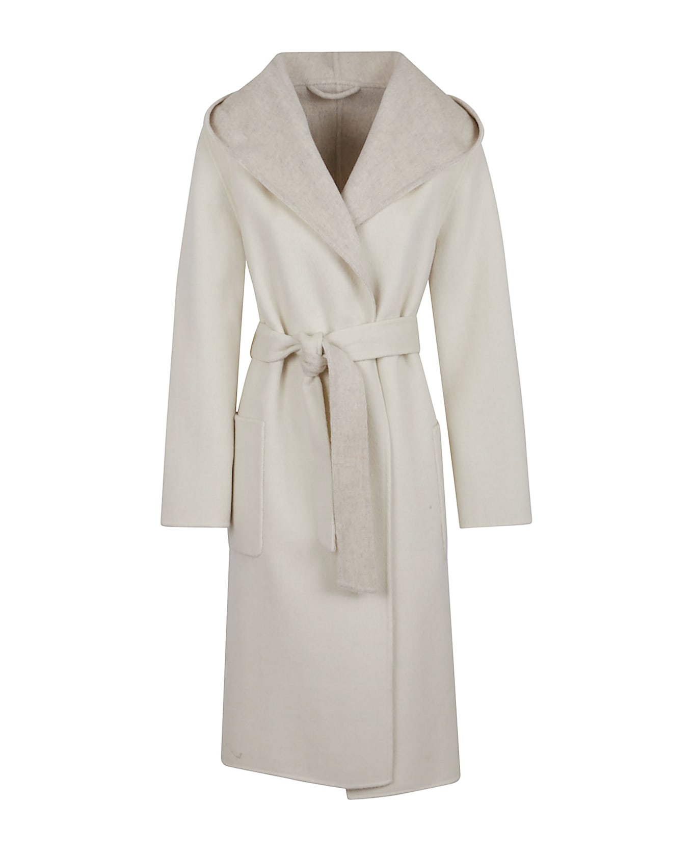 Pure wool coat by PAROSH. Hood; long sleeves; two front patch pockets; knee-length design. Featuring a matching belt at the waist.