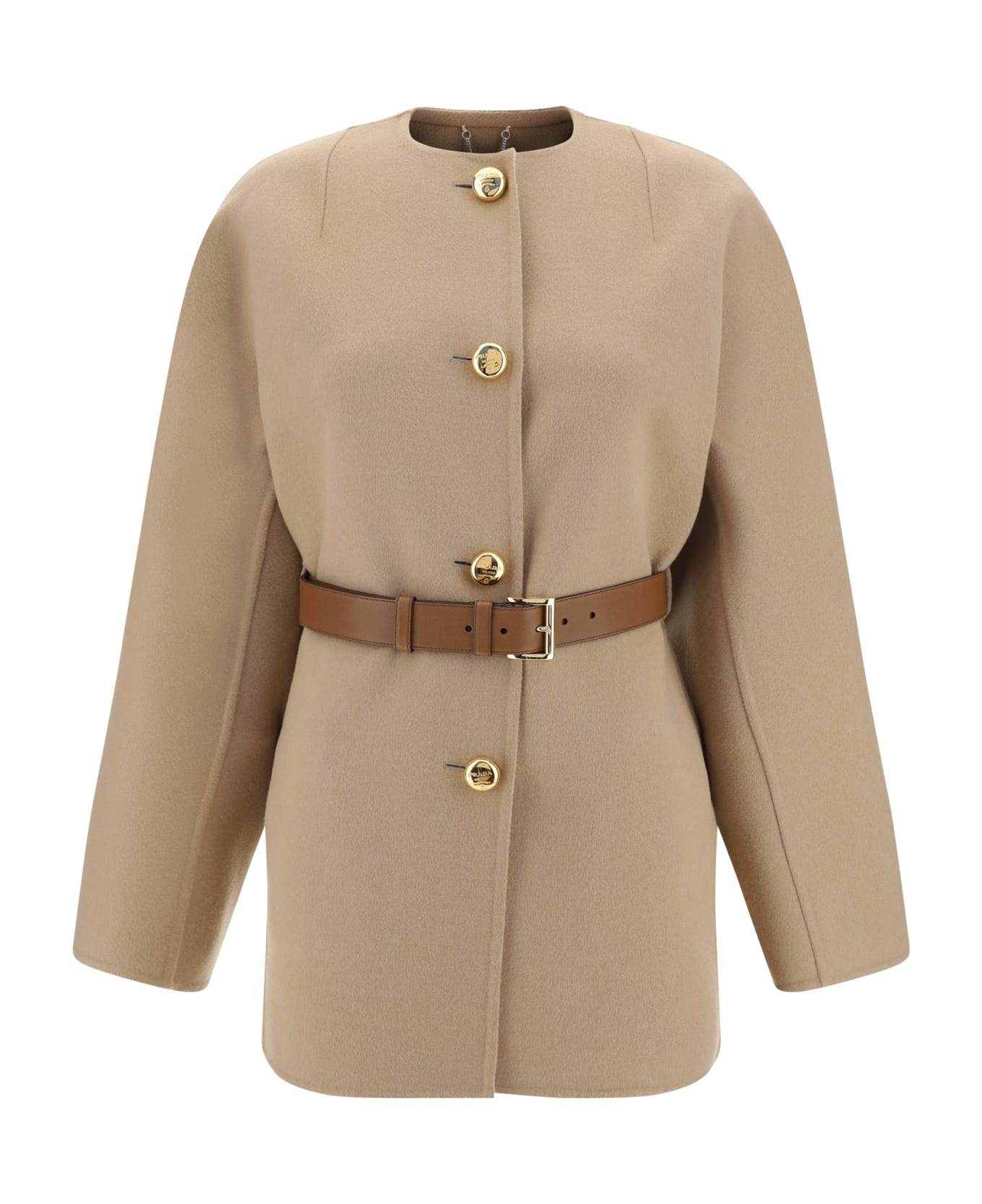 Fleece wool coat by prada, front embossed button closure, two side welt pockets, waist belt loops, contrasting leather matching belt, monochrome pattern, oversize fit. Composition: 1% % Silk, 99% % Fleece Wool