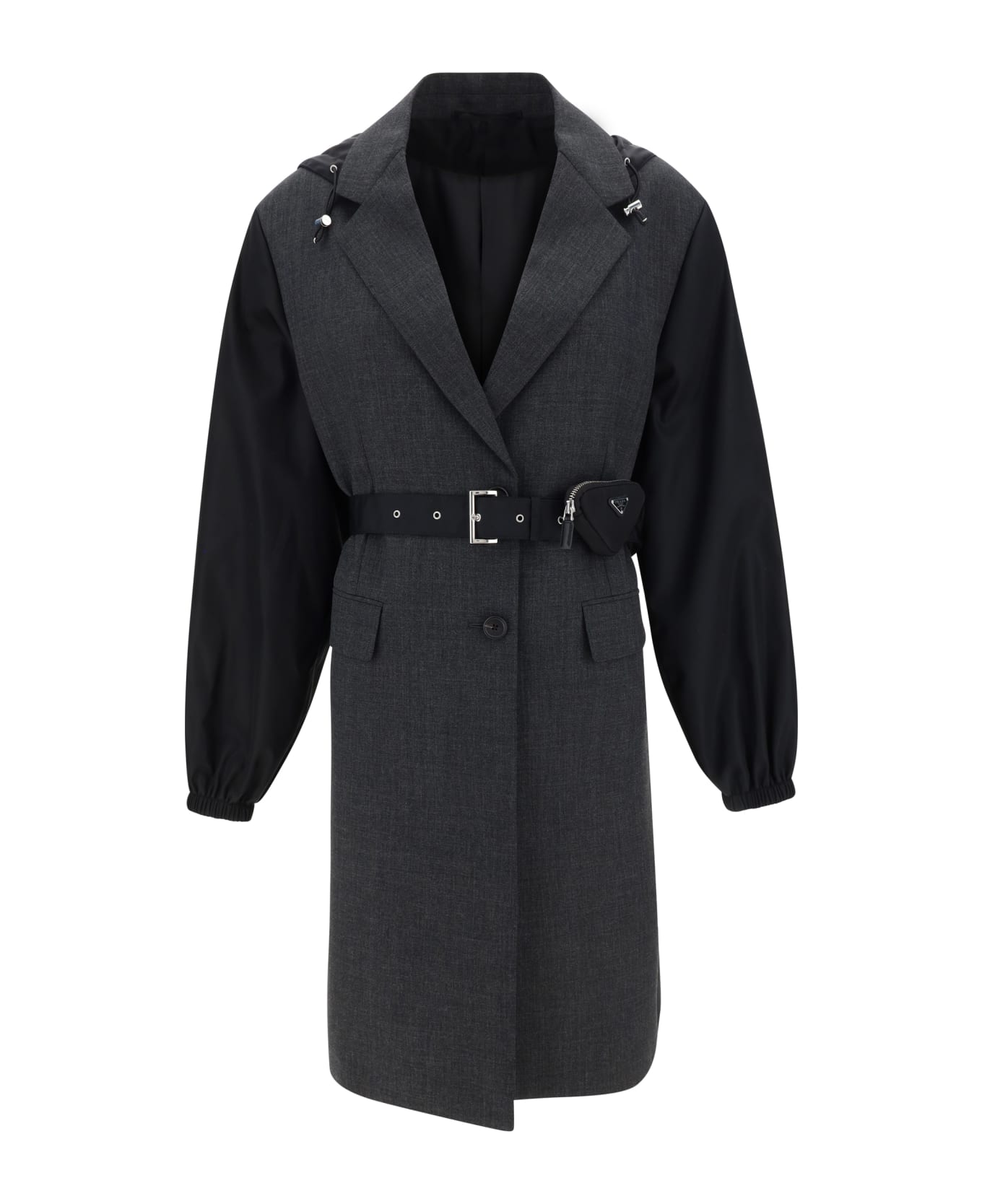 Fleece wool coat by prada, classic lapel front, an adjustable drawstring hood, a contrasting button fastening, two welt pockets with side flaps, a panelled design, windproof fabric sleeves and hood, a waistband embellished with a pocket featuring the brand's iconic triangular design, elasticated cuffs, an iconic triangular enamelled brand signature plaque applied to the front of the breast pocket, and a wide back vent.
