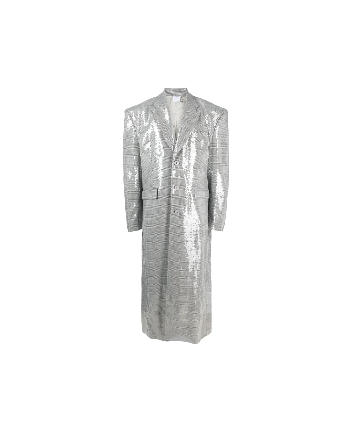 light grey sequin embellishment check pattern shoulder pads notched lapels front button fastening long sleeves buttoned cuffs two side flap pockets straight hem When buying this unisex item, keep in mind that it is graded in standard men's sizing.