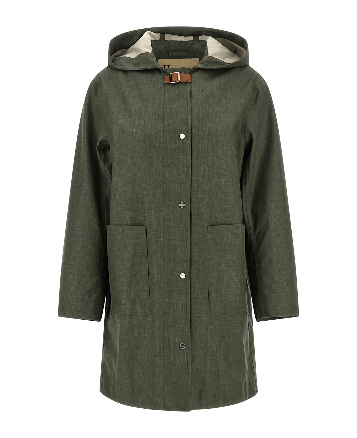 Waterproof in technical linen blend fabric with hood, front closure with snap buttons and buckle strap, straight model with inner drawstring at the waist, long sleeves. Composition: 50% li, 45% wo, 5% se