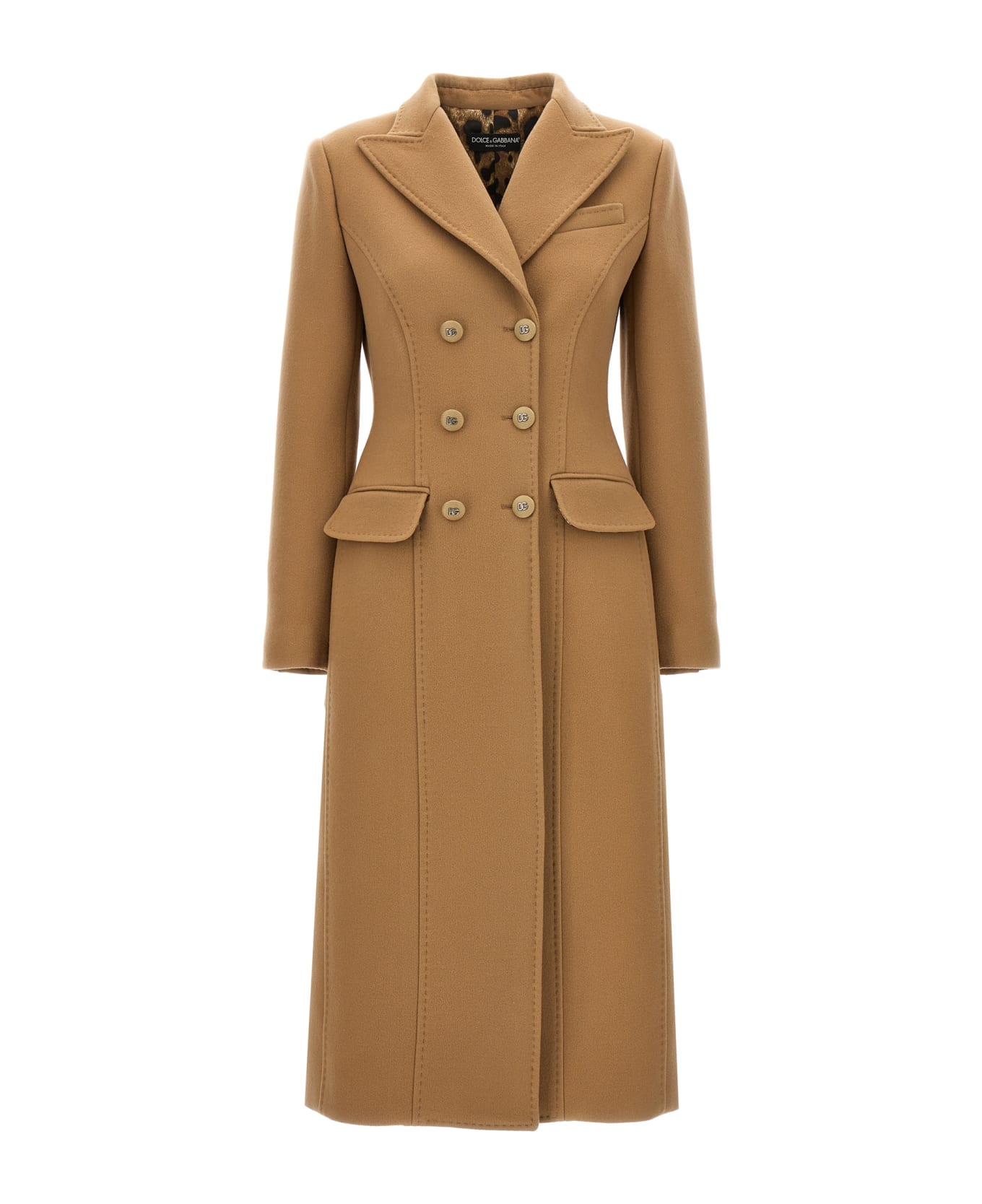 Long double-breasted wool and cachemire coat, model with accentuated waist and split at the back. Composition: 90% virgin wool 10% cashmere