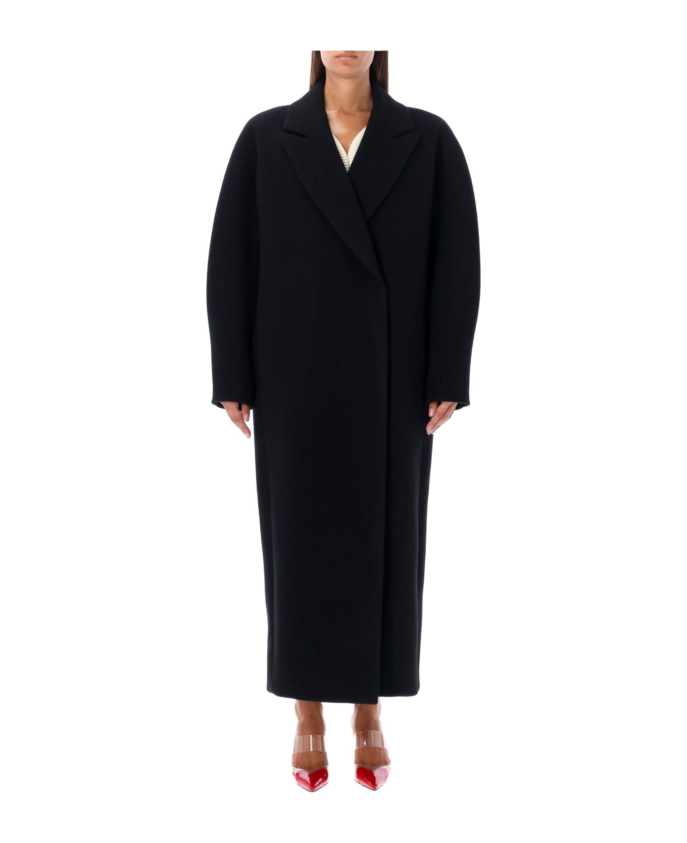 Long Wool Coat By Alaïa. Featuring: Oversized Fit V-neck Above-ankle Length Front Snap Button Closure Side Pockets Model Is 1,72 M Tall And He Is Wearing Size 38