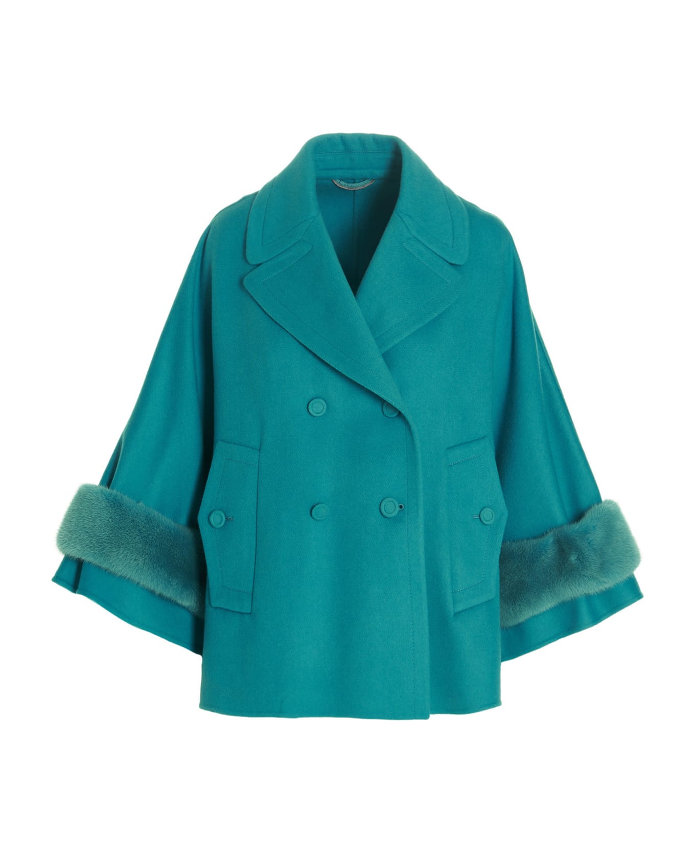 Wool and cashmere coat with mink detailing, a double-breasted style with a button closure, pockets, and wide short sleeves.