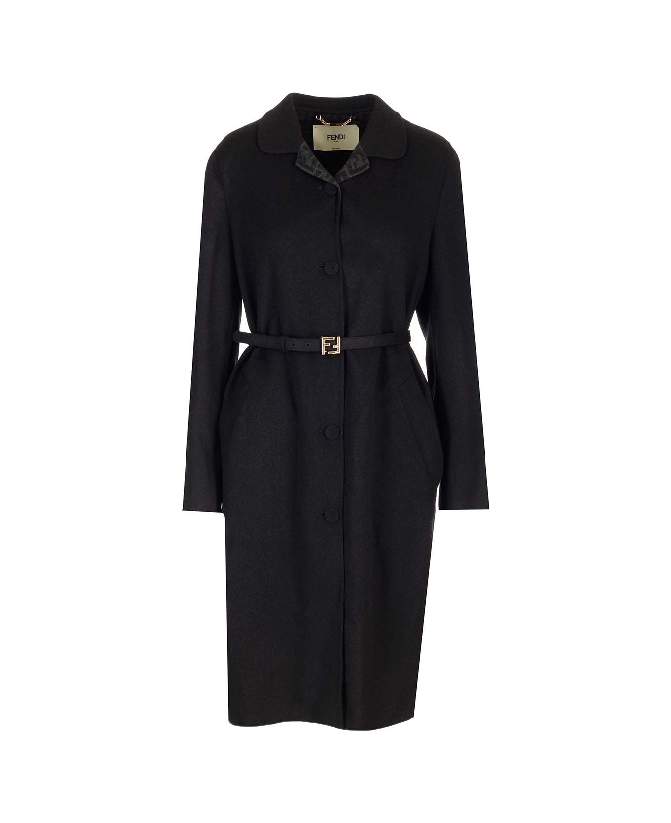 Double wool coat in black wool with belt from Fendi, FF jacquard interior, thin belt with FF golden buckle, full-length front buttons. Composition: COR8KR 99%WV,1%PA+BOTT:100%MDP