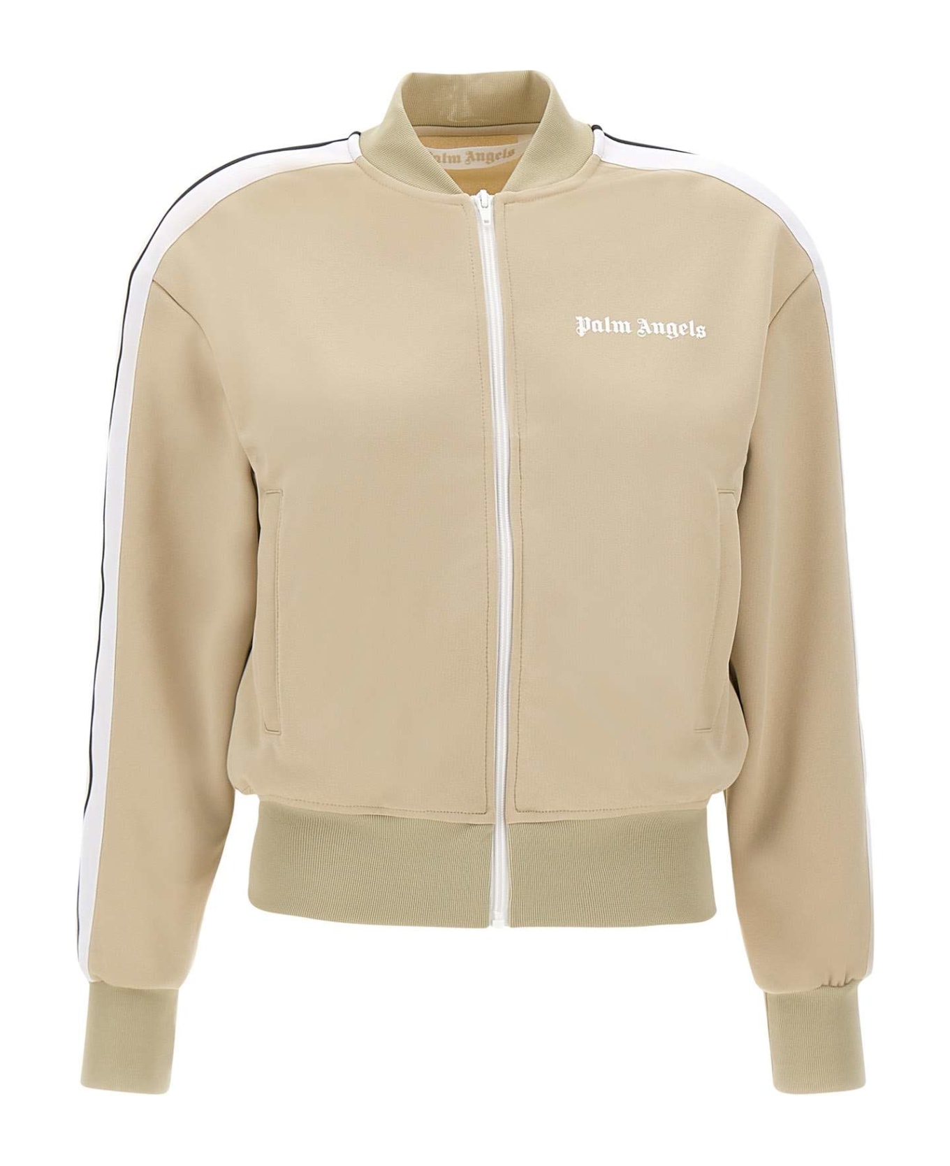 Palm Angels woman 'Bomber Track Jacket ', sand beige, high collar, front fastening with zip, iconic black and white side bands on sleeves, two side slit pockets, white logo print on chest, slightly cropped design, ideal for a sporty look and trendy. Made in Italy.