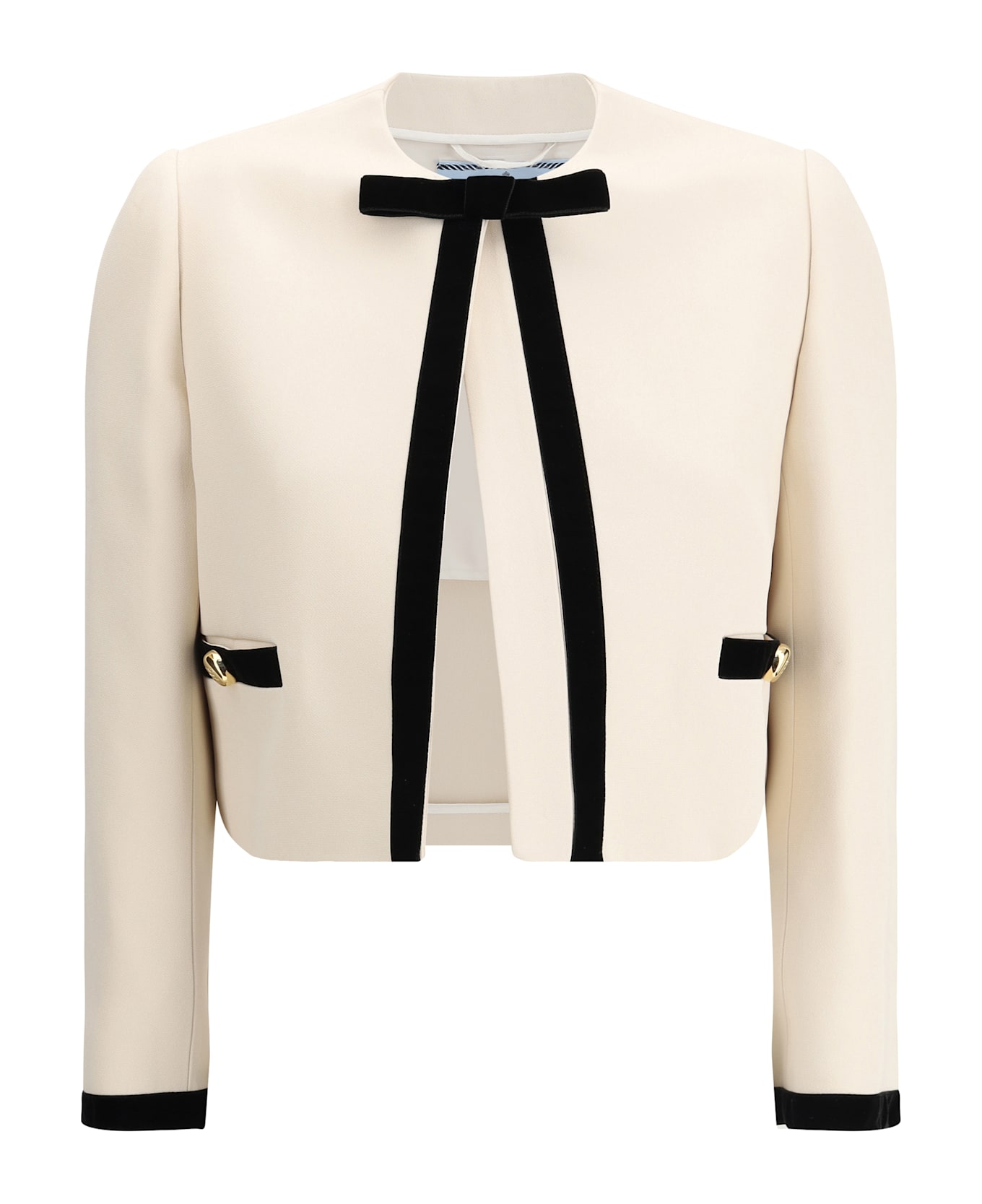 Prada's jacket combines elegance and fine details in a versatile and sophisticated piece. featuring a front closure with a hidden snap button and contrasting velvet details, it has two welt pockets on the front panel that add functionality without sacrificing style. perfect for those looking for a jacket with an understated yet striking design. Composition: 30% % Viscose, 70% % Acetate