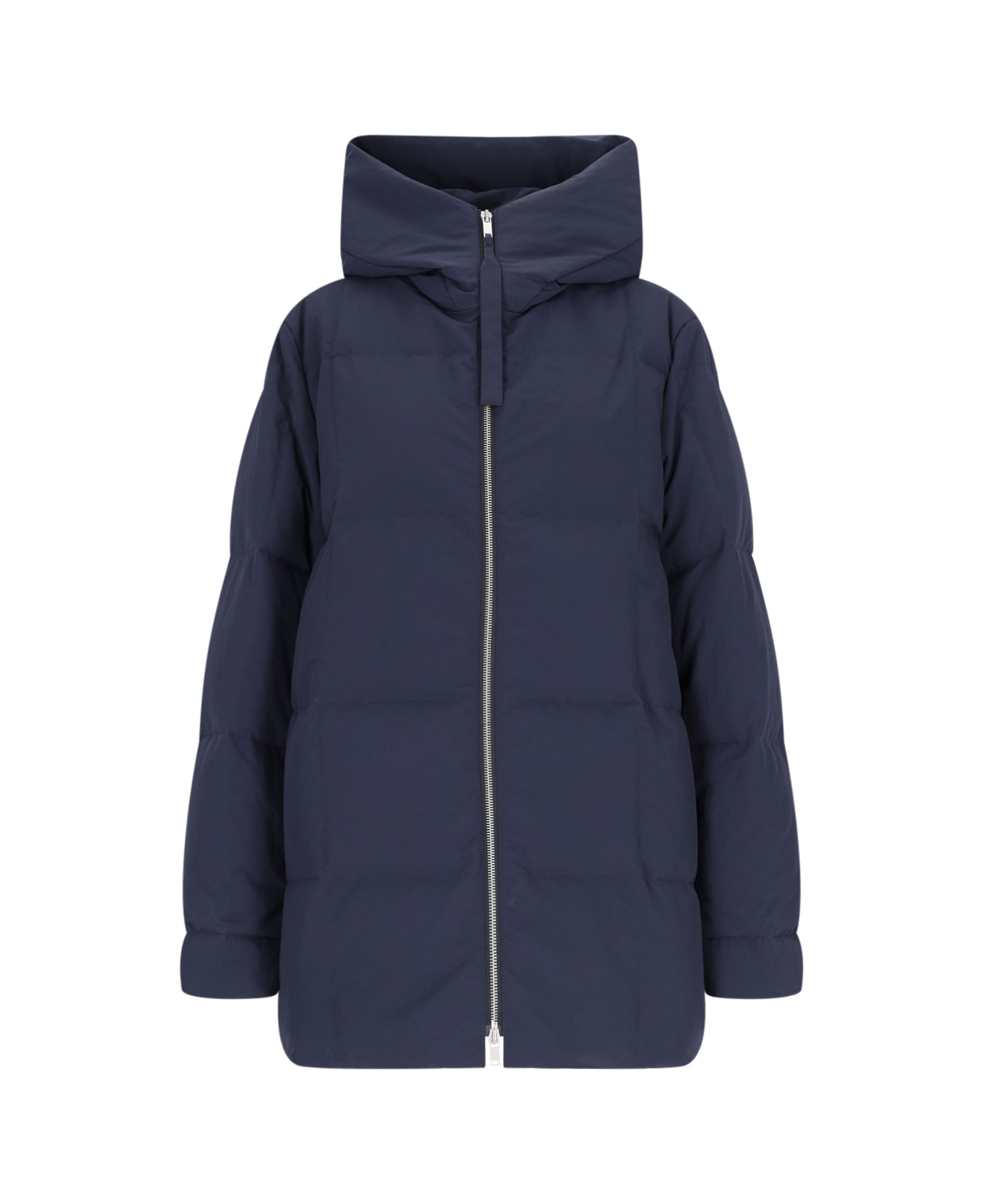 Jil Sander blue quilted puffer jacket in recycled nylon with hood, high neck, front zip closure, two side pockets, straight hem, dust bag included.
