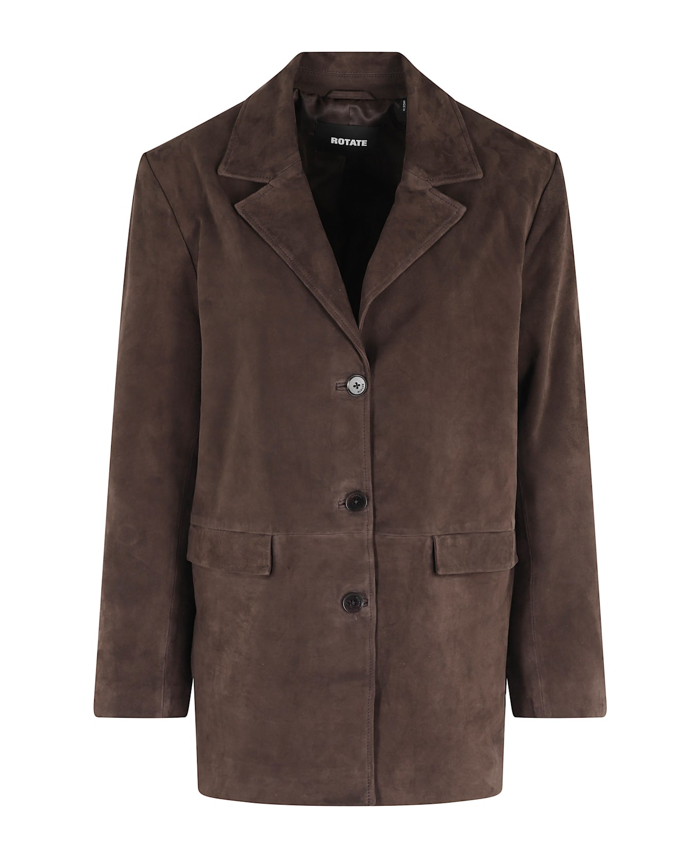 Category: Jacket Item: Suede blazer jacket Brand: Rotate Color: Chocolate brown Neckline: Peaked lapels Pockets: Two flap Details: Button cuffs Closure: Single breasted SIZE AND FIT Fit: Oversize Sleeve length: Long