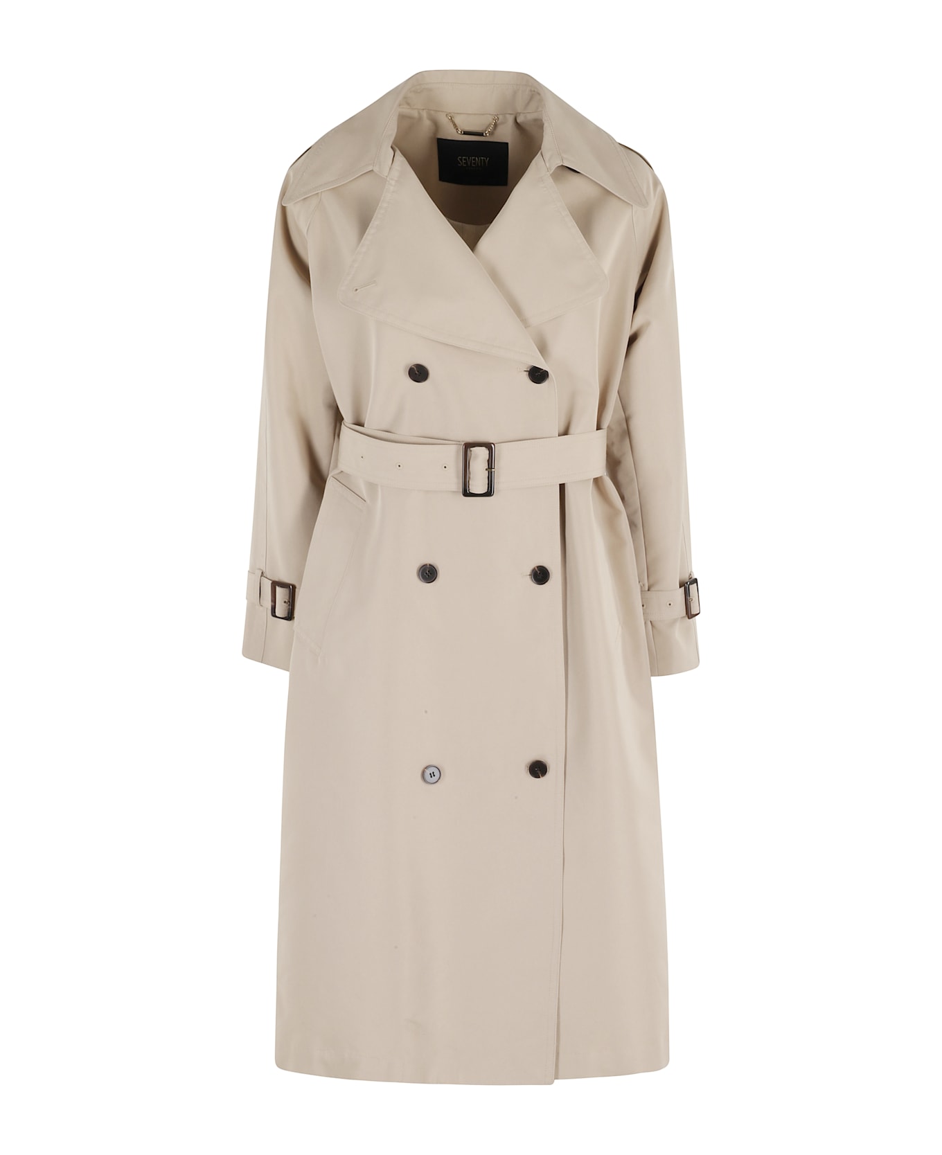 Category: Trench coat Item: Double-breasted trench coat Brand: Seventy Color: Beige Collar: Shirt collar and lapels Pockets: Two side patch Details: Strap on sleeves Closure: With buttons and belt SIZE & FIT Fit: Regular Fit: Straight Sleeve: Long