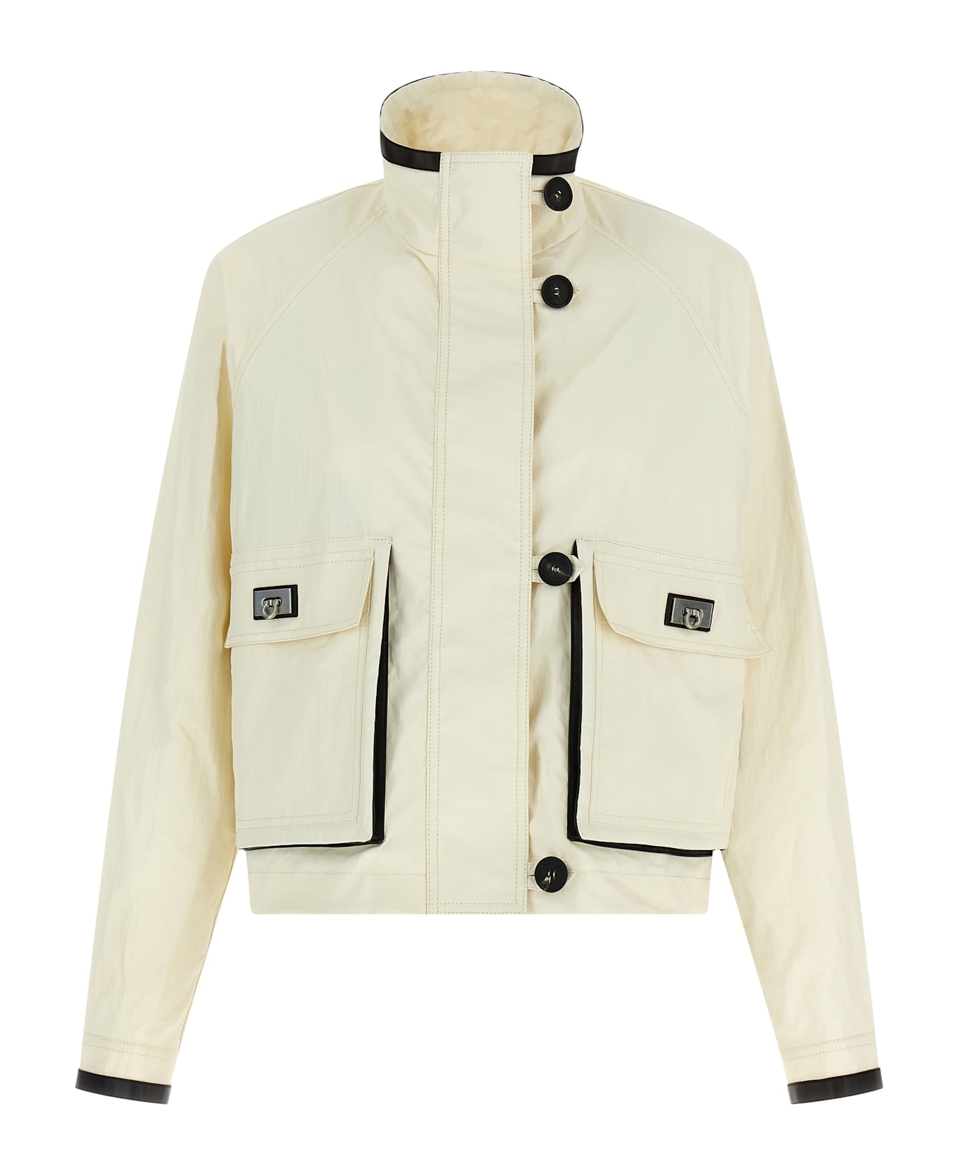 Straight and short jacket in technical linen fabric, high neck with contrasting leather detail on the edge, front zip and flap closure with side buttons, front gusset pockets with leather and flap details with metal hook closure, long sleeves with cuffs and buttons and leather details, Adjustable inner drawstring at the hem.