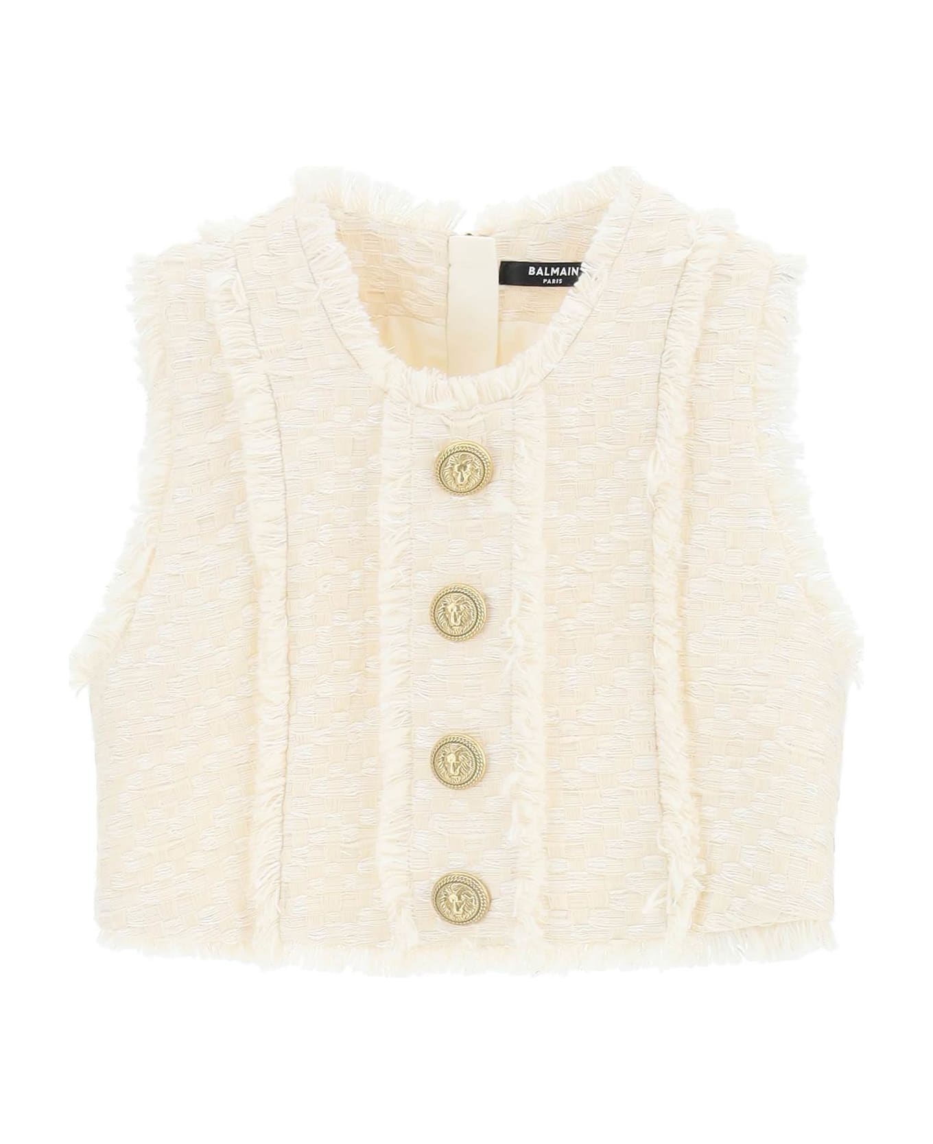 Balmain crop top crafted in cotton-blend tweed with a hint of lurex, adorned with fringed trims and embossed gold-tone metal buttons. Sleeveless design with crew neck and exposed rear zip closure. Lined interior. The model is 177 cm tall and wears a size FR 36.