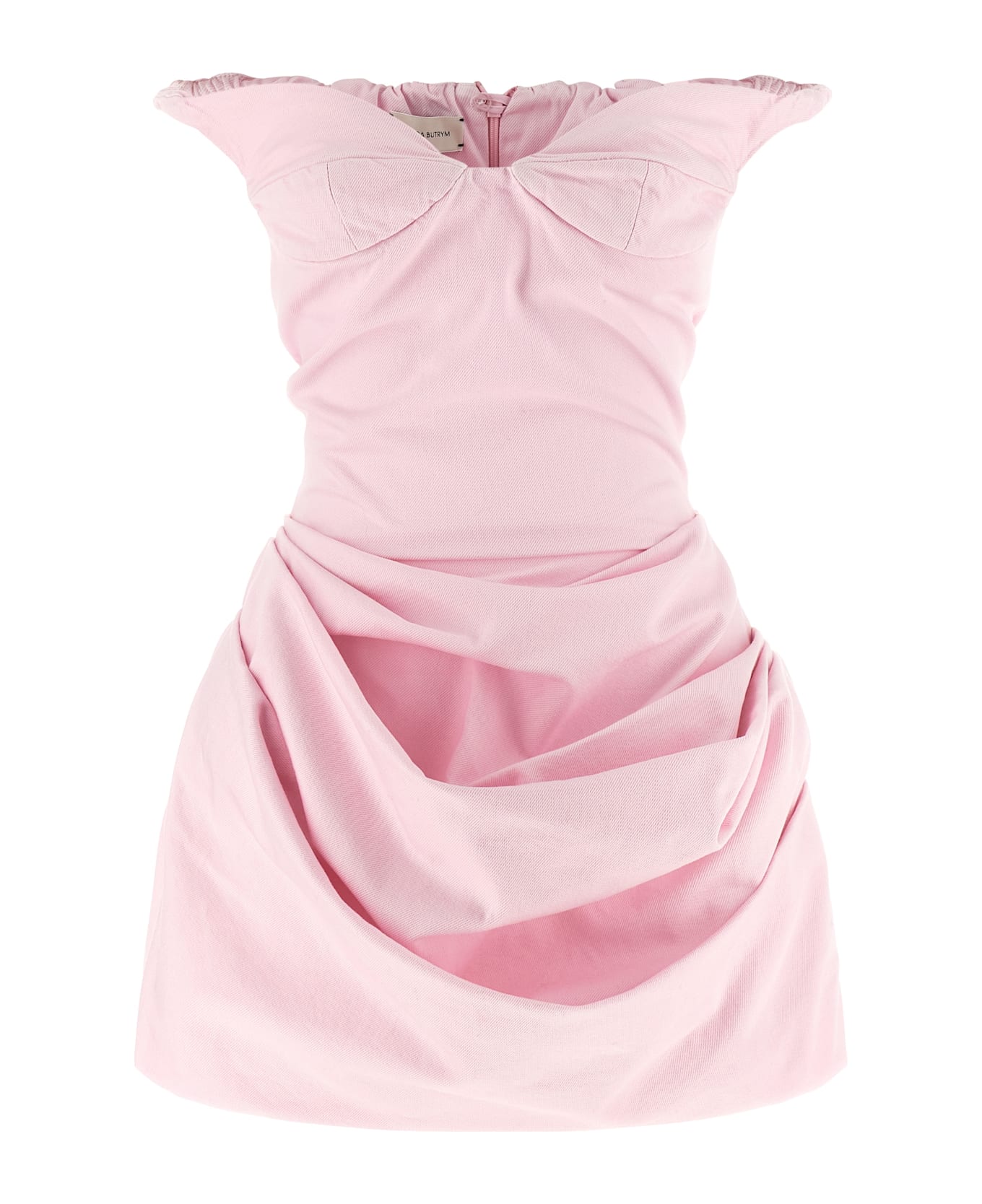 '14' off-the-shoulder minidress in garment-dyed cotton denim with curled upper elastic part, bustier construction with pre-shaped cups and sweetheart neckline, skirt with draping and curling at the front and back, back zip closure. Composition: 100% cotton