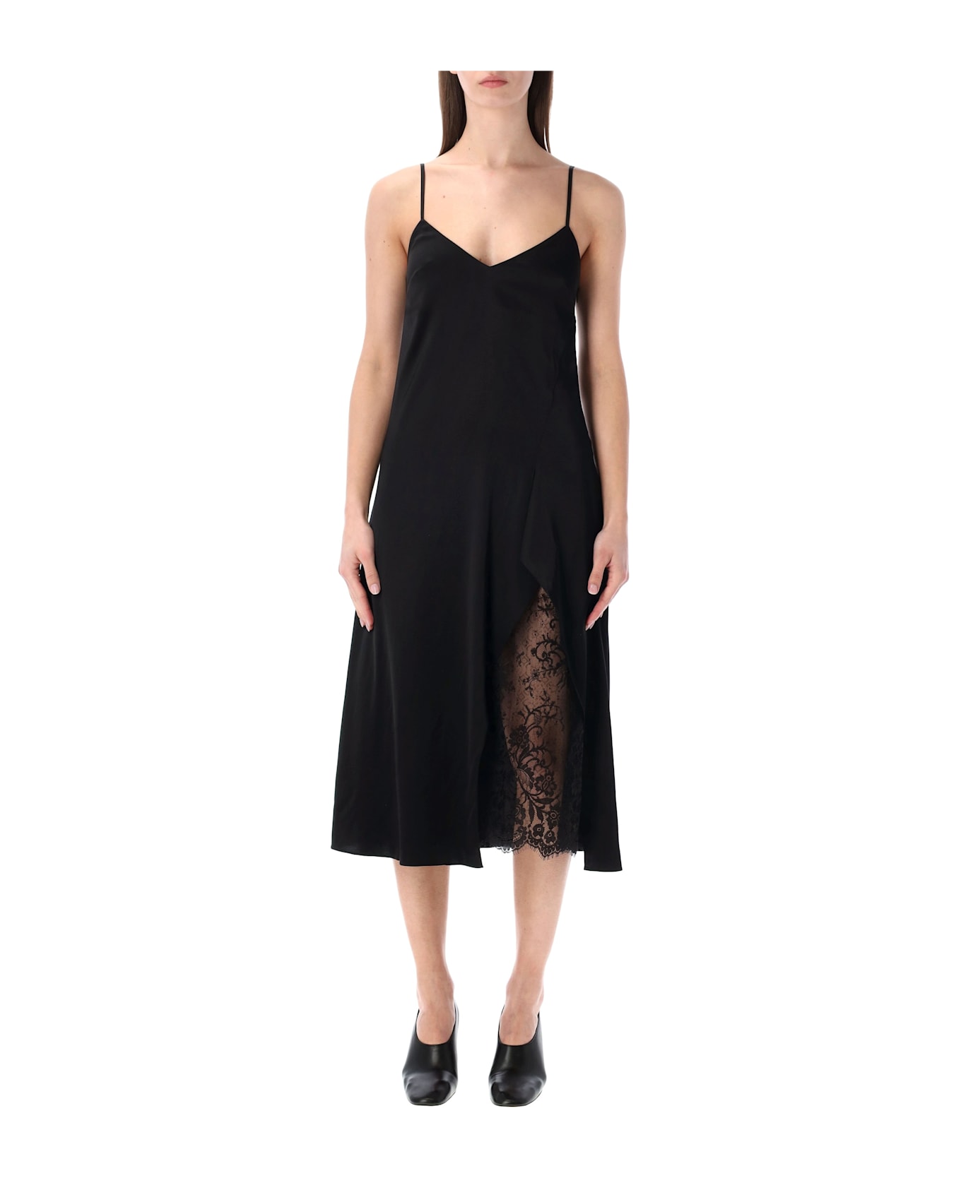 This Acne Studios Slip Dress Is Crafted From Fluid Satin For A Sleek, Luminous Finish. The Ruffled Slit Reveals Delicate Lace, Adding A Feminine And Sophisticated Touch. With Adjustable Elastic Straps And An Invisible Zip, It Fits The Body Gracefully, Perfect For Elegant Evening Occasions Or Special Events. Fitted Silhouette For A Flattering Fit Mid-calf Length Ruffled Slit With Lace Insert Adjustable Elastic Straps Invisible Zip Closure Alessandra Is 1,75 M And Wears Size 36