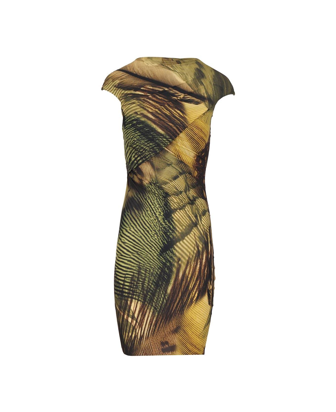 "BIRGIT" short-sleeved mini dress in lightweight stretch jersey by Amazuin, with jungle print, asymmetrical front drape, raw cut hem