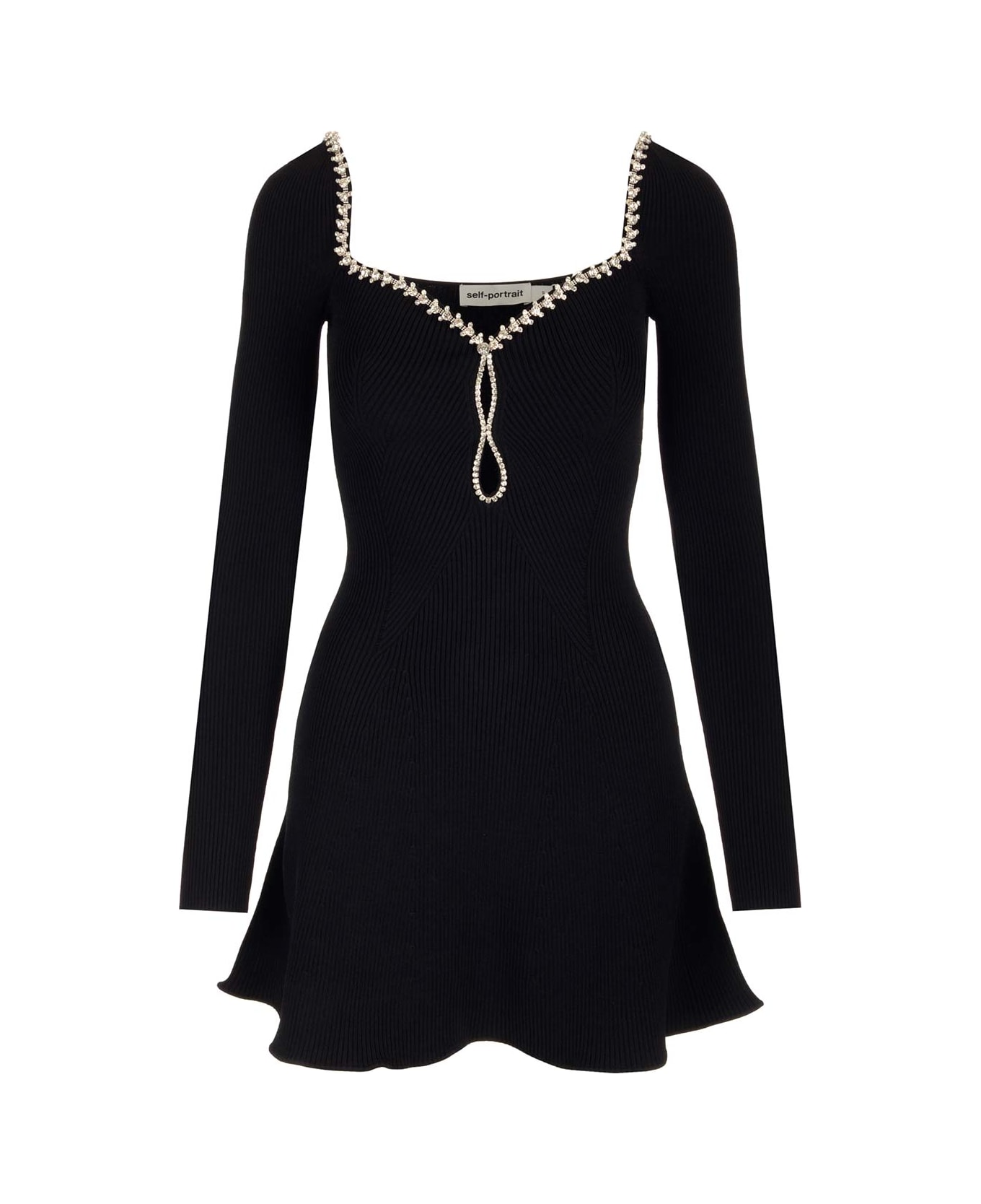 Black mini dress from Self-Portrait in ribbed viscose blend, sweetheart neckline with rhinestones, long sleeves.