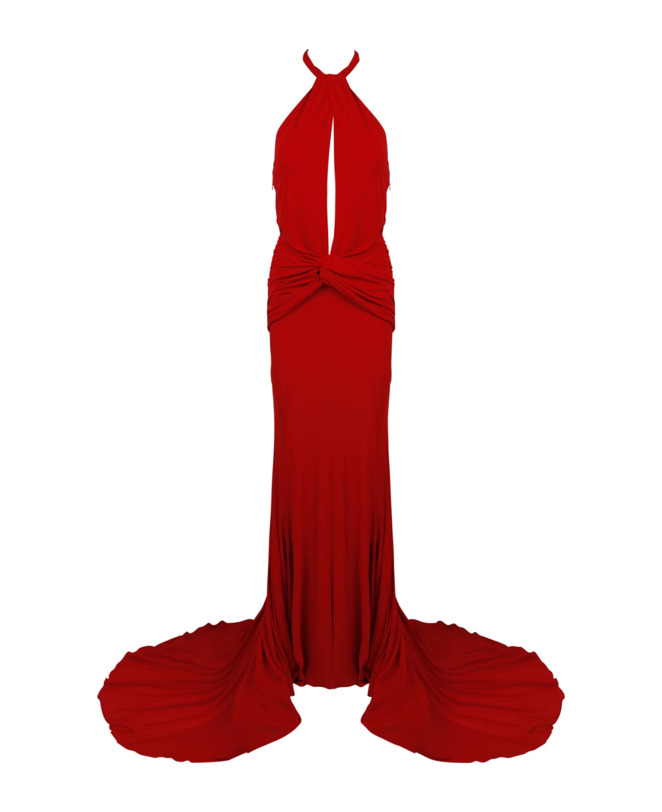 Halter-neck cut-out gown from BLUMARINECut-out detailing. Ruched detailing. Halterneck. Low back. Concealed side zip fastening. High-low hem. Train. 100% Viscose. Made in Italy.