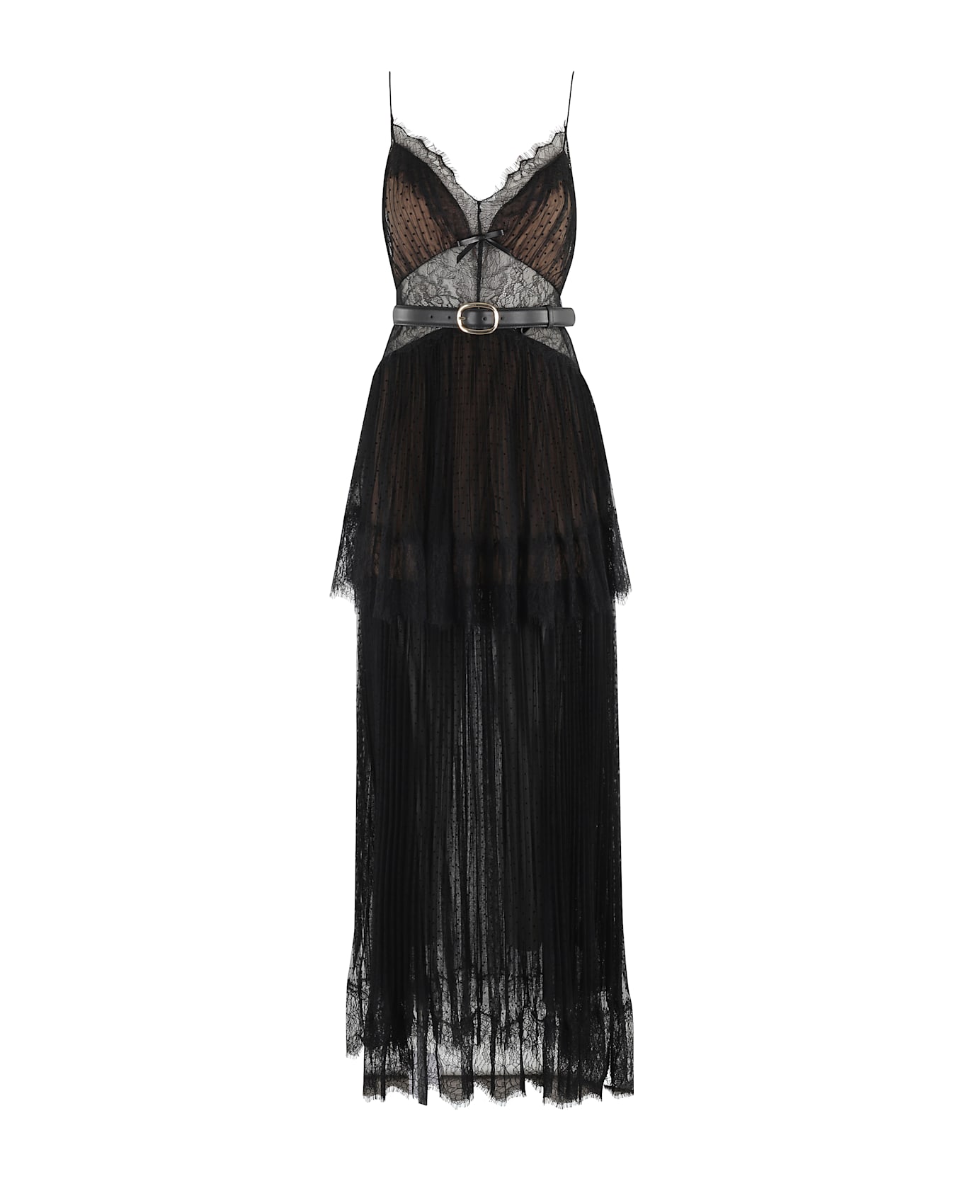 Dress - Self-Portrait - Black color - Polka dot and lace mesh fabric - Bow bodice with straps - Long pleated skirt with lace layer - Removable waist belt - Back zipper closure - Regular fit