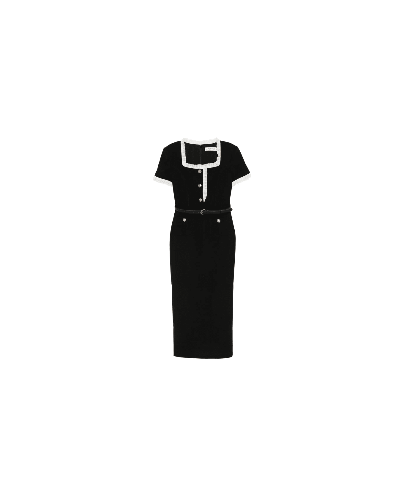 black gold-tone buttons belted short sleeves square neck scalloped trim