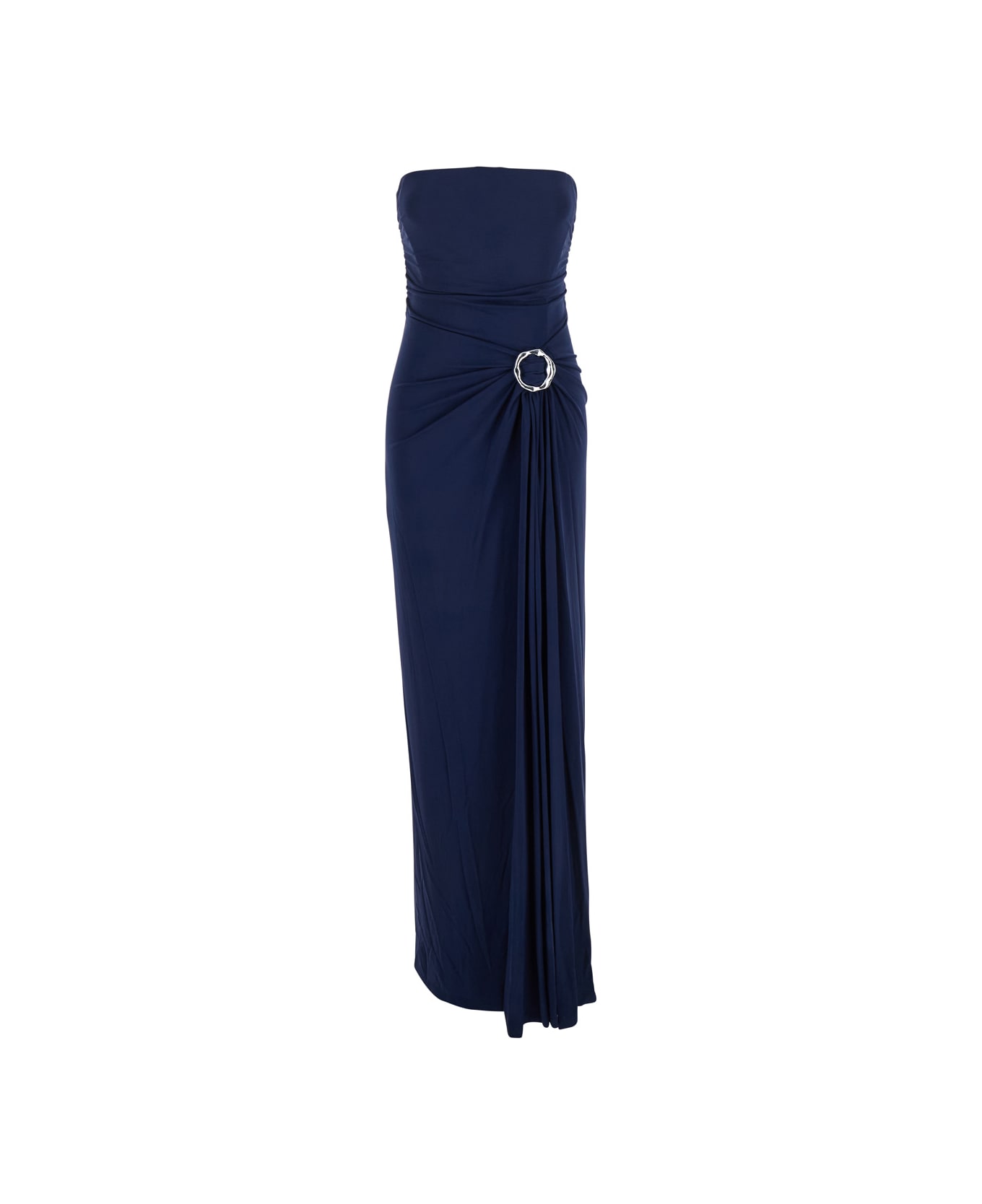 'emma' Blue Strapless Long Dress With Ring Embellishment In Tech Fabric Stretch Woman